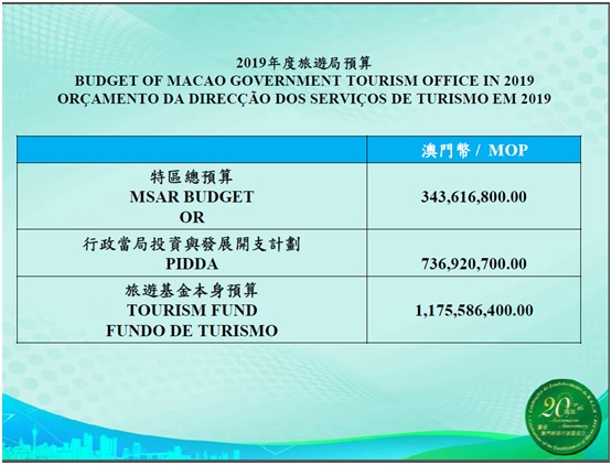Durante a Conferência Anual de Imprensa da Direcção dos Serviços de Turismo (DST) realizada ontem (dia 23) foram divulgados os números relativos ao orçamento anual da DST. Uma vez que no slide referente ao “Orçamento da DST em 2019” o valor apresentado é o número do orçamento final relativo a 2018, disponibiliza-se agora para consulta o valor do orçamento relativo a 2019.