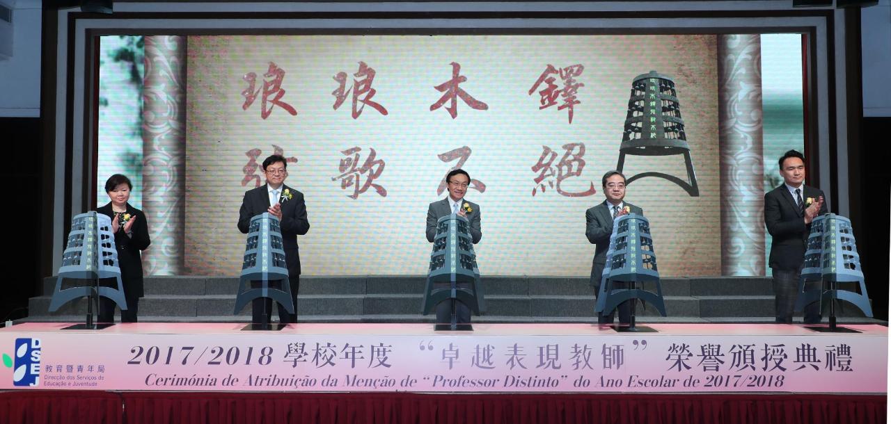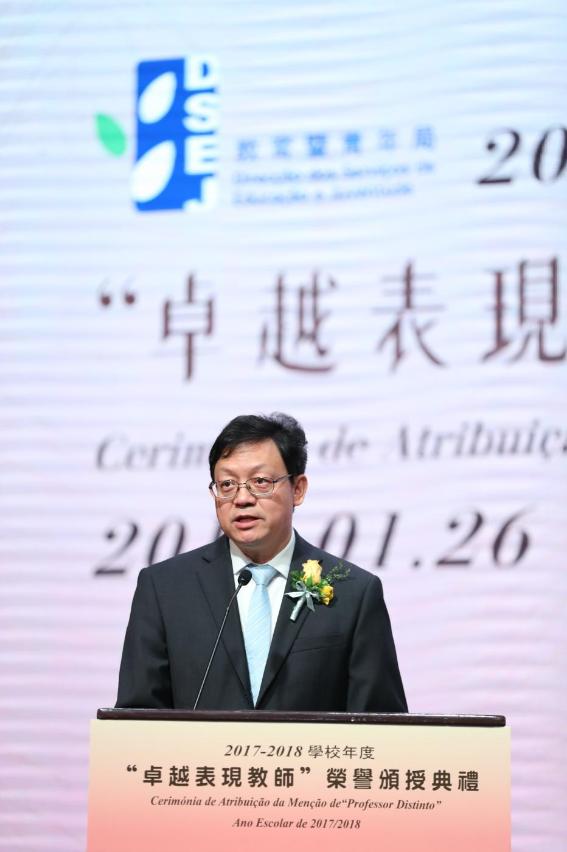 A Direcção dos Serviços de Educação e Juventude (DSEJ) realizou, no dia 26 de Janeiro de 2019, a Cerimónia de Atribuição da Menção de “Professor Distinto” do ano escolar de 2017/2018, que teve lugar no Centro de Convenções e Entretenimento da Torre de Macau, presidida pelos seguintes convidados: Secretário para os Assuntos Sociais e Cultura, Alexis, Tam Chon Weng, director da DSEJ e presidente do Conselho Profissional do Pessoal Docente, Lou Pak Sang subchefe do Departamento de Educação e Trabalhos Juvenis do Gabinete de Ligação do Governo Popular Central na Região Administrativa Especial de Macau (RAEM), Gou Renmin, subdirectores da DSEJ, Leong Vai Kei e Kong Chi Meng. Estiveram ainda presentes: membros do Conselho de Educação para o Ensino Não Superior, do Conselho de Juventude, do Conselho Profissional do Pessoal Docente, do Grupo Coordenador e Consultivo dos Trabalhos dos Cursos de Formação do Pessoal Docente, do grupo de especialistas para apreciação da menção de “Professor Distinto”, dirigentes de escolas e professores, docentes agraciados com a menção, bem como os seus familiares e amigos, num total de cerca de 260 pessoas.