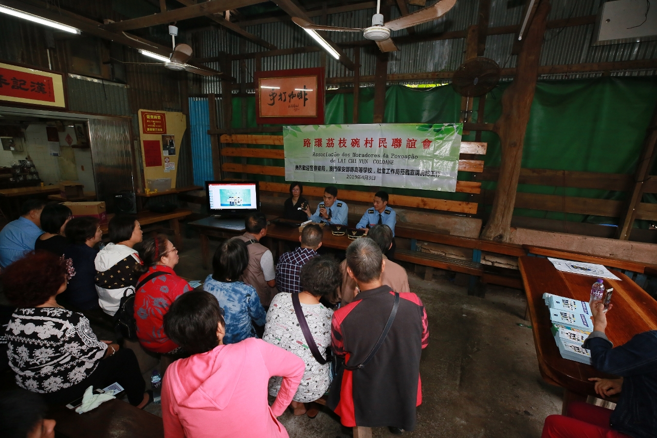Durante a tarde do dia 3 de Abril, a Escola Superior das Forças de Segurança de Macau, em conjunto com os Serviços de Polícia Unitários e o Instituto de Acção Social de Macau, realizaram, no Café Hon Kei em Coloane, uma sessão de esclarecimento e de divulgação do "Plano de evacuação das zonas baixas em situações de “Storm Surge” durante a passagem de tufões”, na qual explicaram aos cidadãos organizados pela Associação dos Moradores da Povoação de Lai Chi Vun de Coloane, os conteúdos do referido plano de evacuação e as observações a seguir. Os conteúdos desta sessão de esclarecimento e de divulgação são divididos principalmente em três partes: 1) conhecimentos sobre a prevenção de desastres e esclarecimento do plano de evacuação; 2) os representantes do Instituto de Acção Social explicaram o funcionamento dos centros de abrigo nas zonas; 3) explicaram e entregaram os rádios de comunicação destinados exclusivamente à protecção civil à Associação dos Moradores da Povoação de Lai Chi Vun de Coloane.