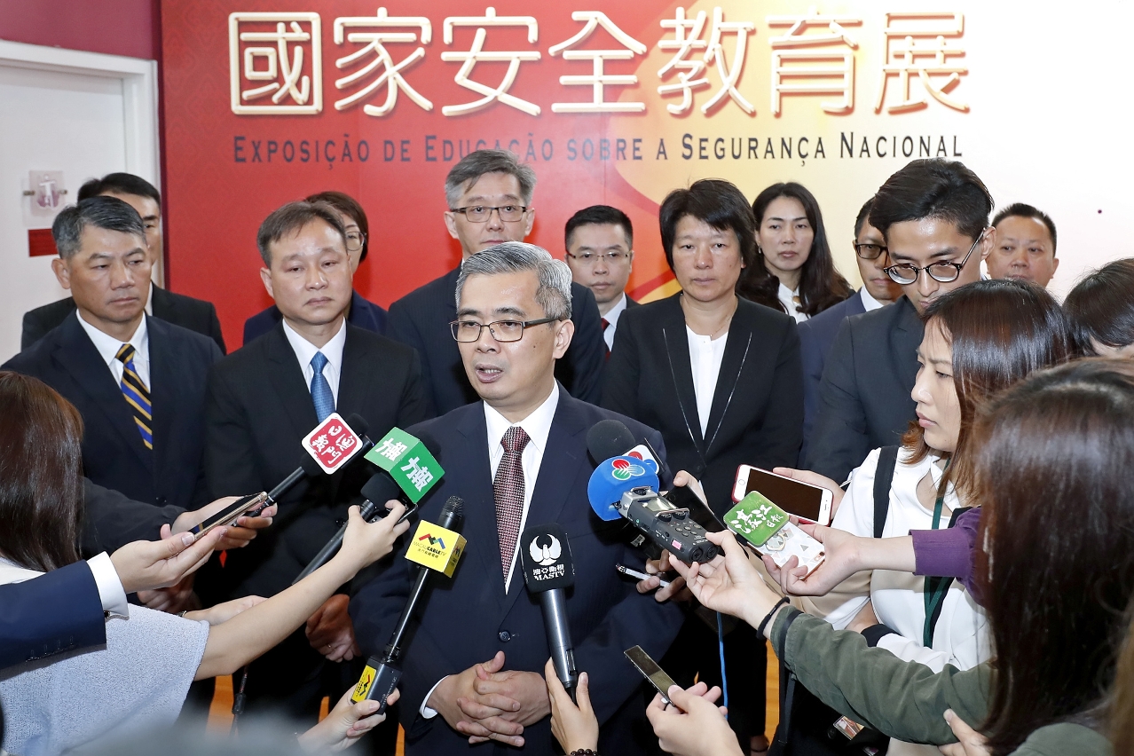 Após a cerimónia de inauguração da Exposição de Educação sobre a Segurança Nacional, o secretário para a Segurança disse à comunicação social que o Governo da Região Administrativa Especial de Macau(RAEM) iniciou, no ano passado, os trabalhos legislativos dos diplomas complementares à «Lei relativa à defesa da segurança do Estado», incluindo as propostas de «Lei da Cibersegurança», em análise na Assembleia Legislativa (AL), o «Regime jurídico do controlo de migração, permanência e autorização de residência», o «Regime Jurídico da Intercepção e Protecção de Comunicações», cujas consultas públicas ficaram concluídas no ano passado. Acrescentou que as propostas de lei de antiterrorismo, de direito processual e de sigilo da segurança nacional, estão a ser acompanhadas pelo Gabinete da Secretária para a Administração e Justiça e pelo Gabinete do Secretário para a Segurança, ou seja, os referidos trabalhos legislativos estão a decorrer de forma ordenada.