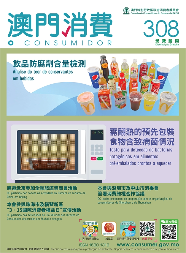 O Conselho de Consumidores (CC) e o Departamento de Segurança Alimentar do Instituto para os Assuntos Municipais (DSA) realizaram conjuntamente os testes sobre o teor de conservantes em bebidas e a situação higiénica dos alimentos pré-embalados prontos a aquecer. Os consumidores podem agora consultar os resultados do teste na edição recentemente lançada da revista “O Consumidor”, que se encontra publicada na página electrónica do CC e na sua conta de WeChat.