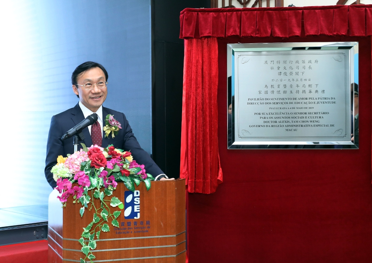 A cerimónia de inauguração do Pavilhão do Sentimento de Amor pela Pátria realizou-se, com sucesso, na tarde do dia 4 de Maio .No seu discurso, o Secretário Alexis Tam salientou que o facto de a DSEJ ter procedido à instalação do Pavilhão do Sentimento de Amor pela Pátria, tornando-o uma base de ensino do Amor à Pátria e a Macau, aquando da comemoração do 100.º Aniversário do “Movimento do 4 de Maio” e do 20.º Aniversário do Regresso de Macau à Pátria, tem um significado extraordinário. O Governo da RAEM tem atribuído grande importância à educação do Amor à Pátria dos jovens alunos, tendo desenvolvido trabalhos a vários níveis e de formas diversificadas, aumentado os seus conhecimentos sobre a história, cultura, política, economia, sociedade e vida da população da Pátria, entre outros, no sentido de promover o seu espírito patriótico e encorajar a transmissão e divulgação da excelente cultura tradicional chinesa. O Pavilhão do Sentimento de Amor pela Pátria oferece aos jovens estudantes um espaço multifuncional, onde poderão conhecer melhor a cultura chinesa, a nação e o desenvolvimento de Macau , participar em actividades pedagógicas diversificadas, com temas ligados ao “Sentimento de Amor pela Pátria”, e realizar a visita de estudo, ao ar livre, “Plano educativo sobre Amor pela Pátria para jovens alunos”. Espera-se que, no futuro, o Pavilhão do Sentimento de Amor pela Pátria possa desenvolver as suas funções e cooperar com os diversos sectores da sociedade, especialmente com o sector educativo e as associações juvenis, aprofundando o ensino do Amor à Pátria e a Macau dos jovens estudantes.