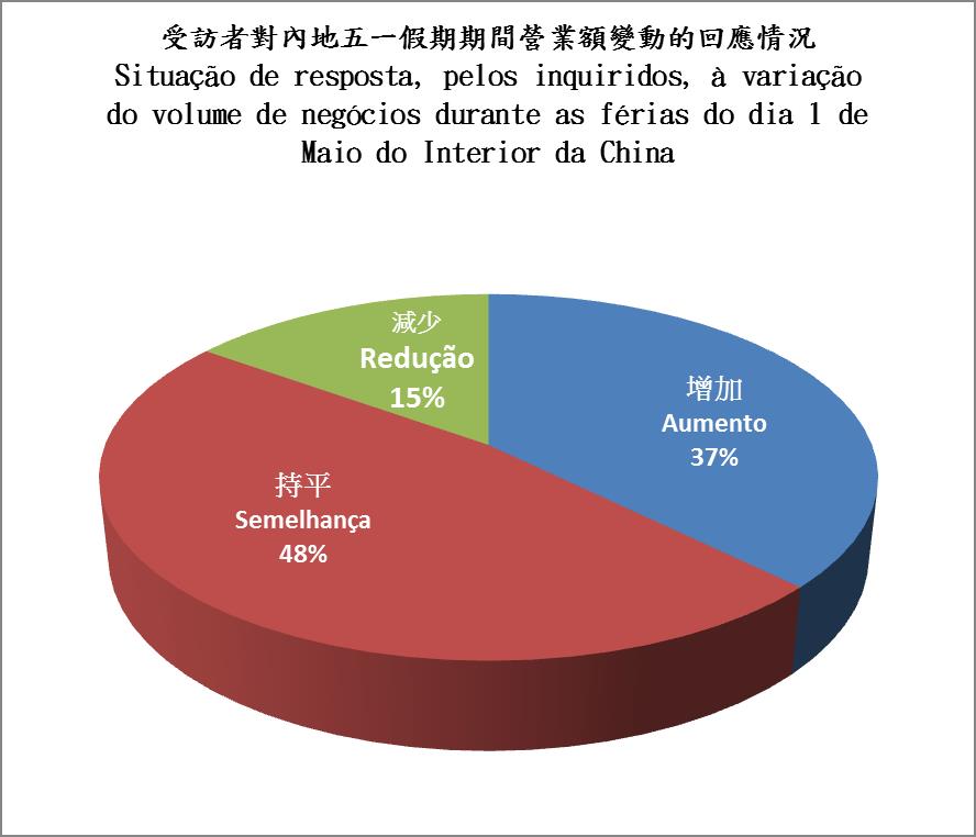 Pelo exposto, os feriados do dia 1 de Maio do Interior da China geraram um efeito positivo e impulsionador para os sectores de restauração e comércio a retalho de Macau. De ponto de vista da movimentação de pessoas e do volume de negócios, as lojas situadas em resort hotels and shoppes na zona do Cotai, Rua de Pedro Nolasco da Silva, Largo do Senado, Rua do Cunha na Taipa, Praia Grande, Avenida de Almeida Ribeiro e Zona de Ferreira de Almeida beneficiaram mais dos efeitos dos feriados do dia 1 de Maio. Foi igualmente descoberto, neste inquérito, que a movimentação de pessoas e o volume de negócios das lojas de diversas zonas durante os feriados do dia 1 de Maio se encontraram uma relação de proporcionalidade directa, ou seja, o volume de negócios das zonas em que a movimentação de pessoas aumentou mais do que nos dias normais também subiu.