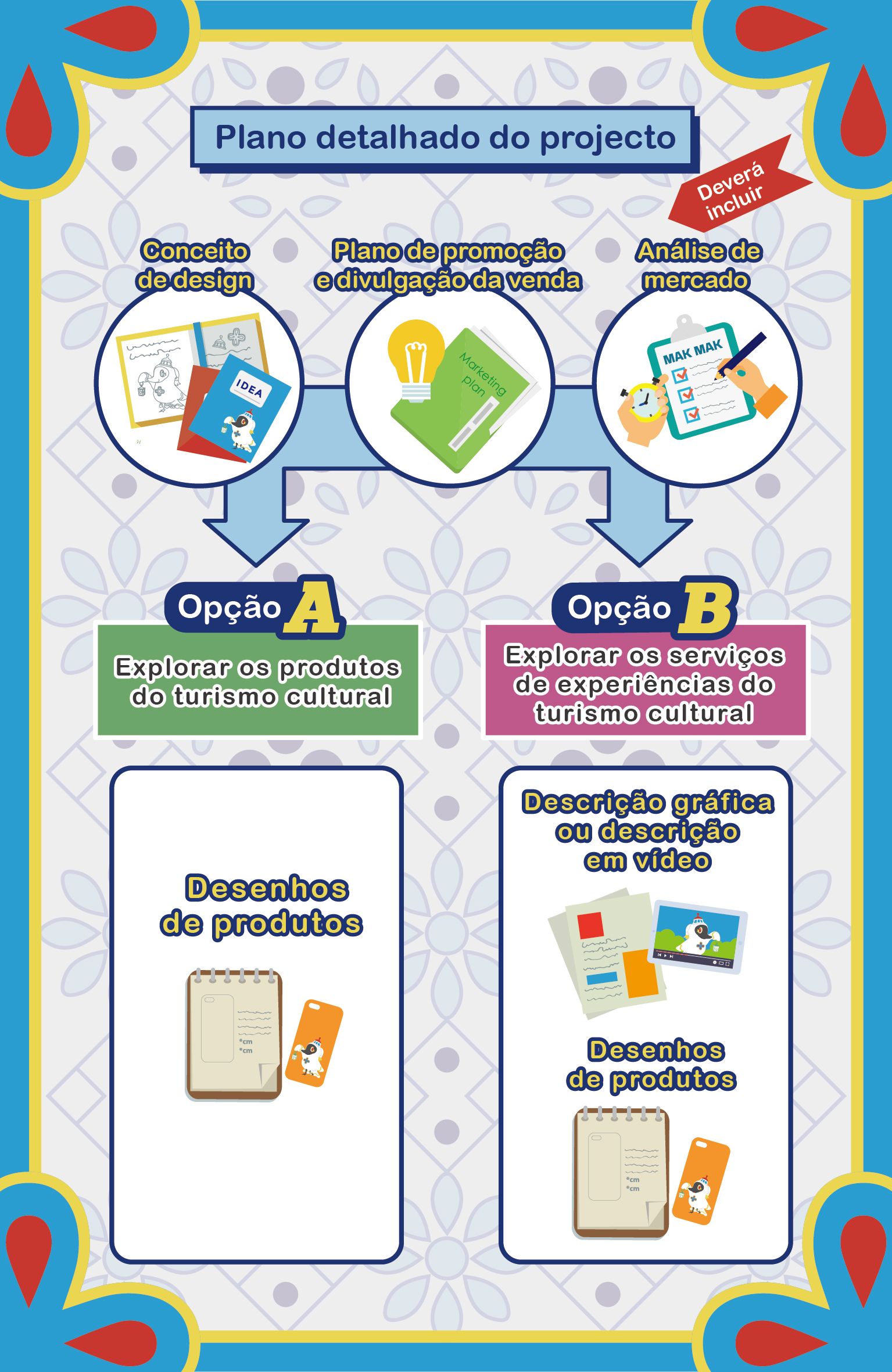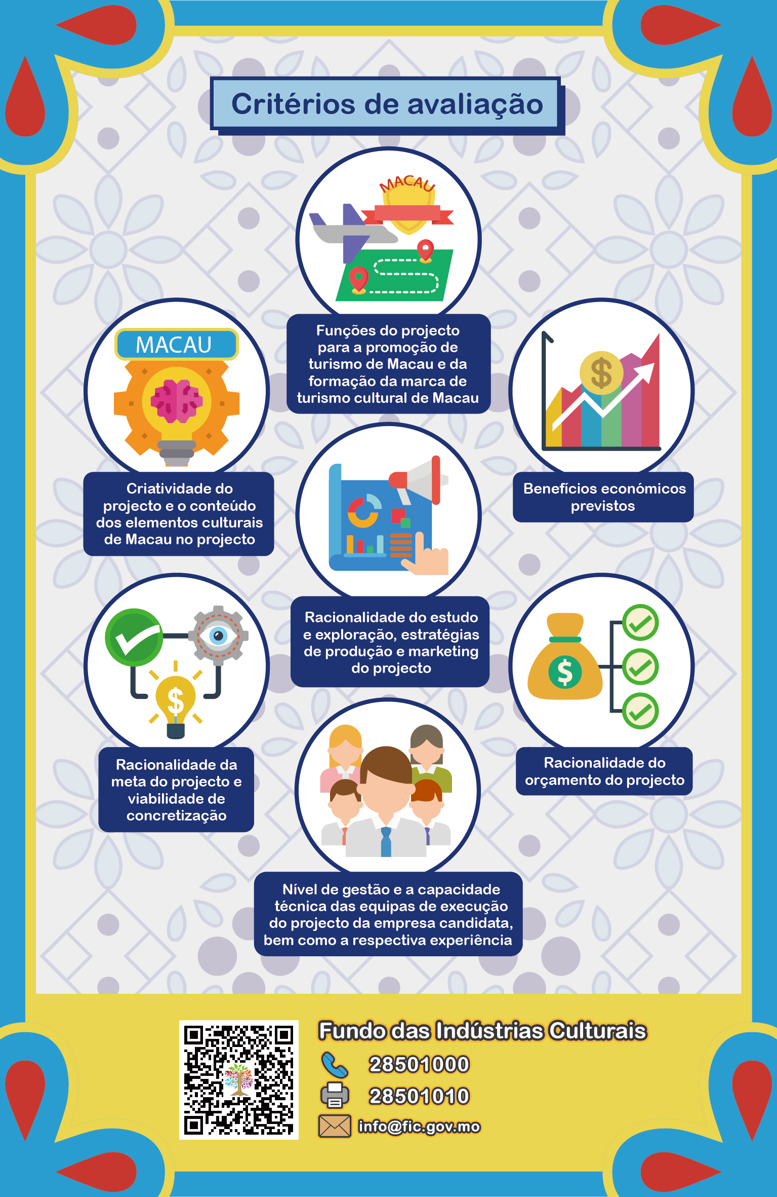 O plano do projecto deverá incluir o conceito de desenho, o plano de promoção e divulgação e da venda, informações sobre a análise de mercado; para a exploração de produtos do turismo cultural, é preciso incluir os desenhos de produtos, enquanto exploração de serviços de experiências de turismo cultural, exigem-se a descrição gráfica ou a descrição em vídeo do conceito, e, desenhos de produtos. A Comissão de Avaliação de Projectos irá proceder à avaliação aplicando os seguintes critérios: as funções do projecto para a promoção de turismo de Macau, e da formação da marca de turismo cultural de Macau; a criatividade e o conteúdo dos elementos culturais de Macau; os benefícios económicos previstos; a racionalidade da meta e a viabilidade de concretização; a racionalidade do orçamento; o nível de gestão e a capacidade técnica das equipas de execução da empresa candidata, bem como a respectiva experiência, e, a racionalidade do estudo e exploração, estratégias de produção e marketing do projecto.