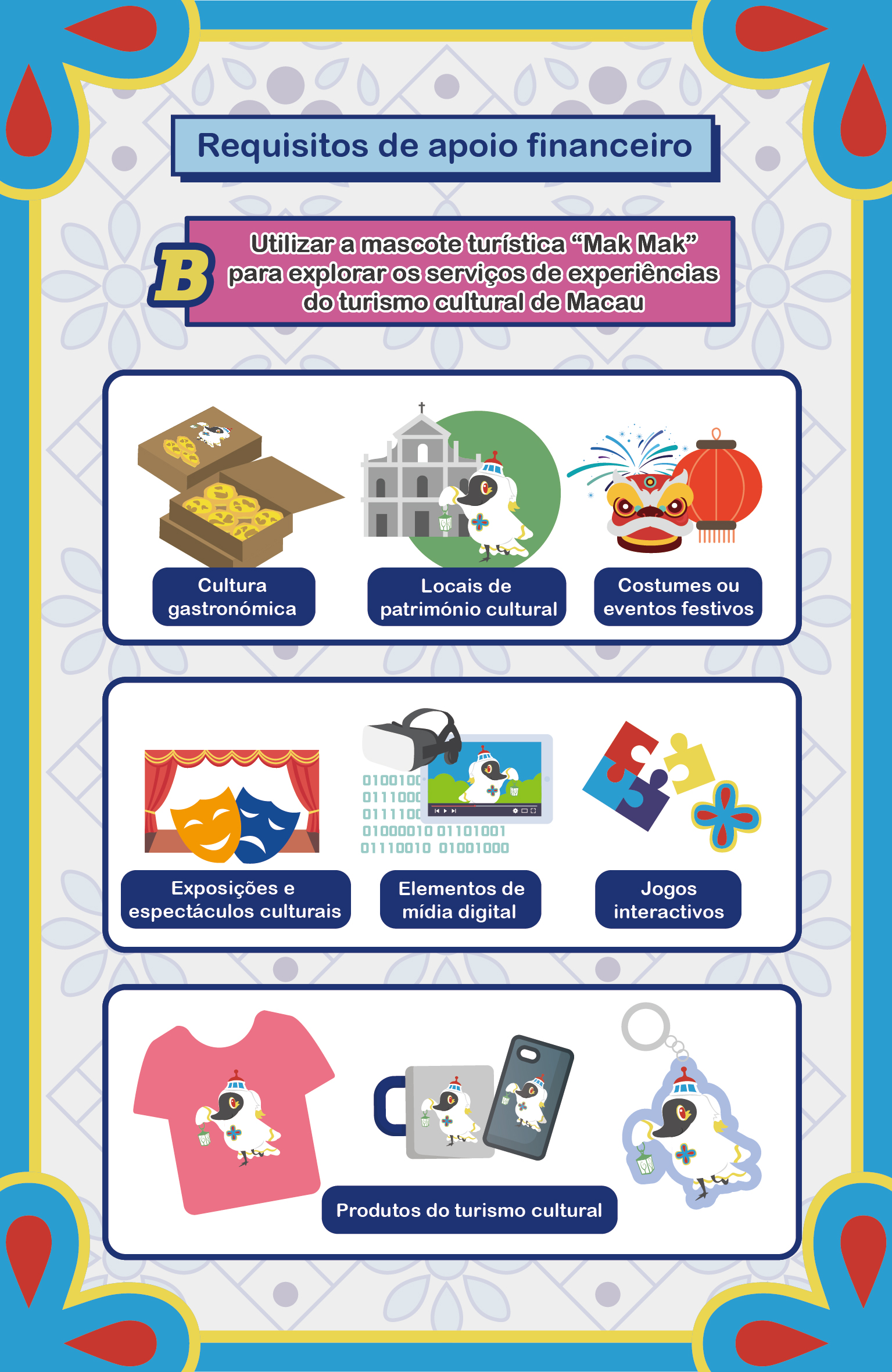 Ao explorar projecto de serviços de experiência de turismo cultural de Macau na utilização da mascote “Mak Mak”, o projecto deverá estar relacionado com os elementos culturais de Macau, tais como locais de património cultural, edifícios novos e antigos, cultura gastronómica, monumentos históricos nos bairros comunitários, criatividade cultural dos bairros comunitários, paisagens turísticas, património cultural intangível ou costumes festivos etc; o projecto deve conjugar elementos de exposições e espectáculos culturais ou de mídia digital, como animação, tecnologias digitais (como realidade aumentada de AR, realidade virtual de VR, realidade híbrida de MR) ou jogos interactivos, podendo ainda, utilizar a mascote turística “Mak Mak” para explorar produtos de turismo cultural. Recomenda-se que o projecto seja concluído através da cooperação de várias empresas, sendo uma das empresas o representante principal do projecto para apresentação da candidatura, podendo o candidato formar e integrar livremente o conteúdo dos serviços caracterizados de experiências de turismo cultural a serem explorados.