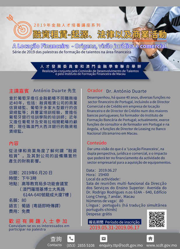 Com o objectivo de desenvolver em Macau actividades financeiras com características próprias, o Governo de Macau acabou, no passado mês de Abril, a revisão e a publicaçãodo Regime Jurídico das sociedades de locação financeira. No seguimento do último seminário, realizado sobre FinTechstic, co-organizado pela Comissão de Desenvolvimento de Talentos e pelo Instituto de Formação Financeira de Macau, realiza-se no próximo dia 20 de Junho, às 15h00, um seminário intitulado “Locação financeira – origem, regime jurídico e actividades comerciais”, que terá lugar na sala polivalente, no 7.º andar da Direcção dos Serviços do Ensino Superior (no Edifício Long Cheng, na Avenida Dr. Rodrigo Rodrigues n.ºs 614A-640, Macau).