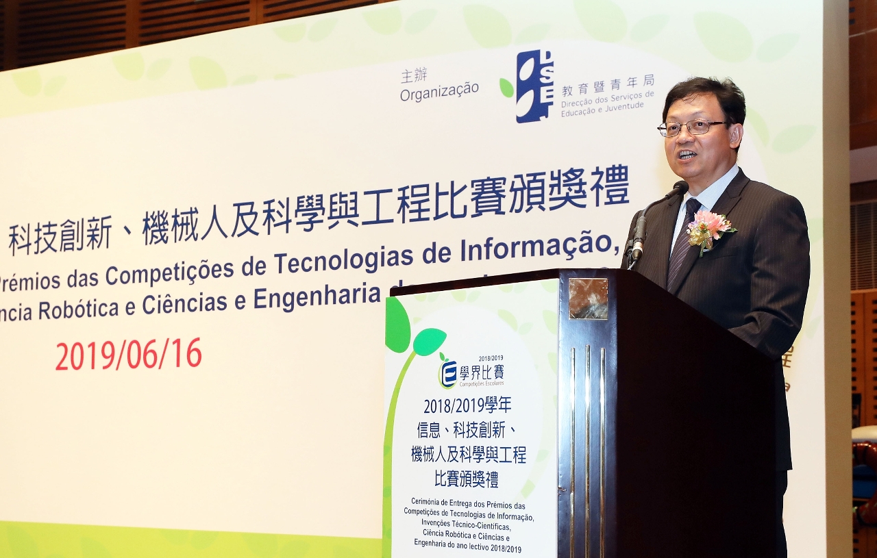 Para reconhecer os esforços dos estudantes premiados nos quatro concursos escolares de generalização dos conhecimentos científicos, a DSEJ realizou, no dia 16 de Junho, no Centro de Convenções do Centro de Ciência de Macau, a “Cerimónia de Entrega dos Prémios das Competições de Tecnologias de Informação, Invenções Técnico-Científicas, Ciência Robótica e Ciências e Engenharia do ano lectivo 2018/2019”.