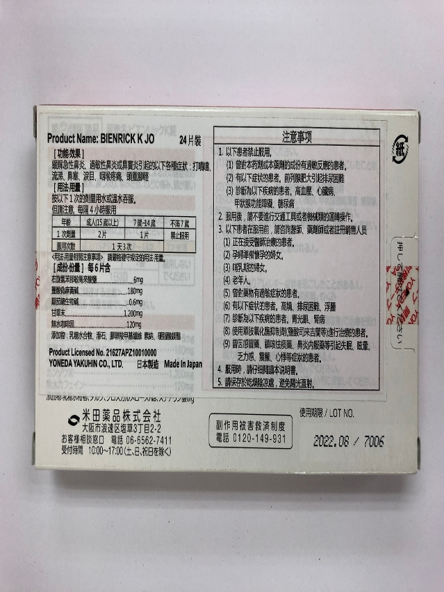 Ao procederem à vigilância de rotina de medicamentos no mercado de Macau, os Serviços de Saúde detectaram que os limites microbianos do medicamento prescrito "Bienrick K JO Tablets", com o n.º do lote 7006, fabricado pela Companhia Yoneda Yakuhin Co., para o tratamento de rinite, ultrapassam os critérios farmacológicos, pelo que os Serviços de Saúde ordenaram a recolha de medicamentos tendo os importadores de medicamentos manifestado intenção imediata de os retirar do mercado.