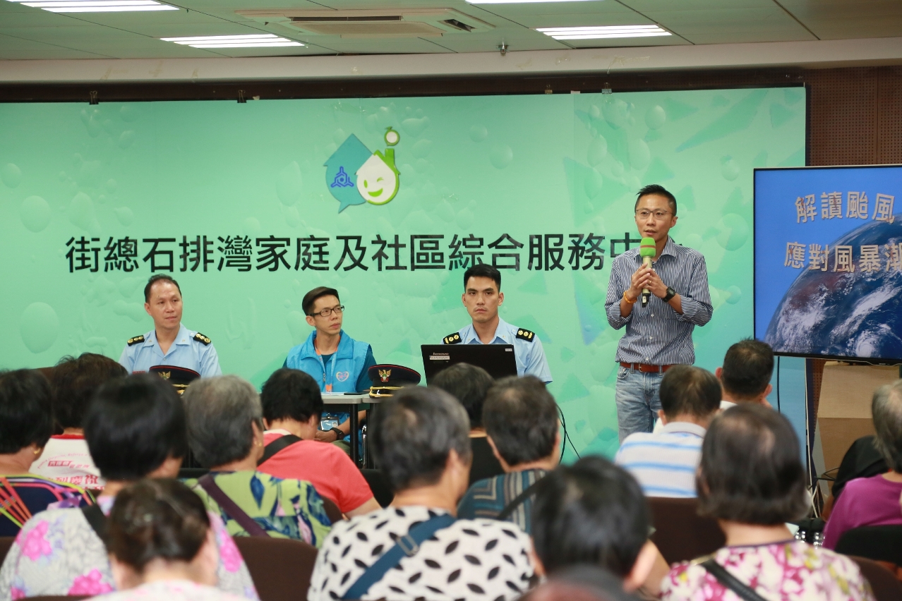 Antes do simulacro, realizou-se, em primeiro, uma sessão de esclarecimento no Centro Integrado de Serviços de Família e Comunidade de Seac Pai Van da União Geral das Associações dos Moradores de Macau, em que se introduziram, principalmente, as climas e condições meteorológicas extremas, os conhecimentos relativos a vários avisos sobre fenómenos meteorológicos severos, os conteúdos do “Plano de evacuação das zonas baixas em situações de “Storm Surge” durante a passagem de tufões”, os sistemas de divulgação e aviso de protecção civil, a preparação para saco de emergência, as observações a seguir na deslocação ao centro de abrigo, e os factores de consideração para a selecção de rotas de evacuação, a importância de estocar suprimentos de emergência na vida diária, os locais de encontro para as pesseoas com necessidades, o funcionamento e a disponibilidade do centro de abrigo.
