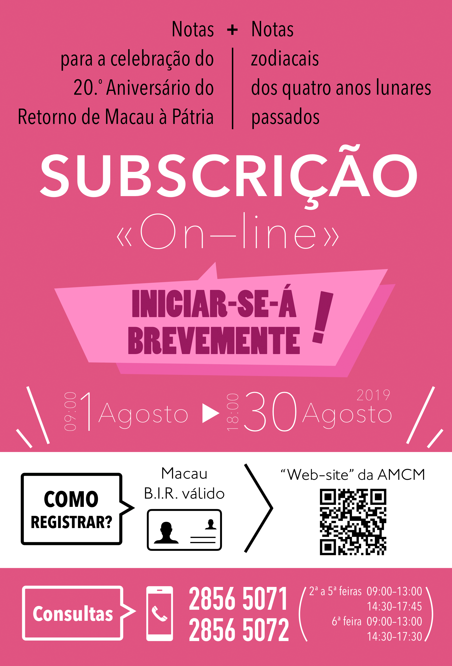 A subscrição “on-line” das notas para a celebração do 20.o Aniversário do Retorno de Macau à Pátria e das notas zodiacais dos quatro anos lunares passados (incluindo os anos do Macaco, do Galo, do Cão e do Porco) será iniciada a partir das 9 horas de 1 de Agosto de 2019, podendo os residentes de Macau efectuar a subscrição através do “web-site”. A subscrição tem um período de quatro semanas e terminará às 18 horas de 30 de Agosto de 2019. A Autoridade Monetária de Macau informa que os residentes interessados na troca das referidas notas zodiacais devem proceder, até ao termo do prazo, à prévia subscrição “on-line”, de modo a evitar a perda da oportunidade de subscrição.