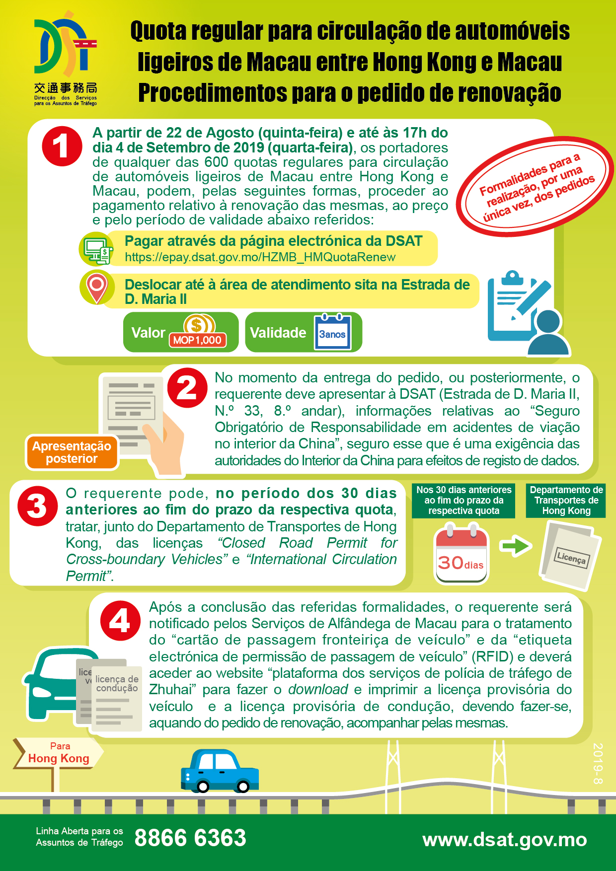 A Direcção dos Serviços para os Assuntos de Tráfego (DSAT), a partir de 22 de Agosto (quinta-feira) e até às 17 horas do dia 4 de Setembro de 2019 (quarta-feira), aceitará, por uma única vez, o pedido de renovação de qualquer das 600 quotas regulares destinadas à circulação de automóveis ligeiros de Macau entre Hong Kong e Macau e pertencentes a entidades particulares e comerciais, sendo que o prazo de validade das quotas renovadas será de três anos.