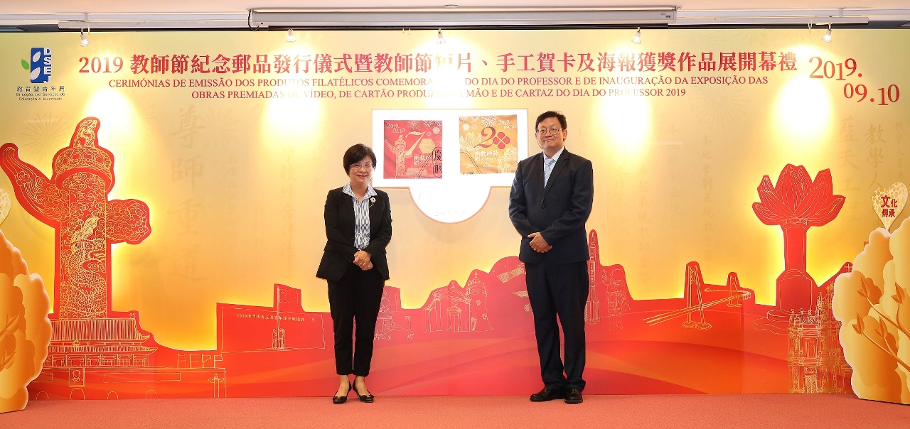 A Direcção dos Serviços de Educação e Juventude (DSEJ) e a Direcção dos Serviços de Correios e Telecomunicações colaboraram, continuamente, este ano, na emissão de produtos filatélicos comemorativos do Dia do Professor, tendo organizado, ainda, um Concurso de Design de Vídeo, de Cartão Produzido à Mão e de Cartaz do Dia do Professor, como iniciativa importante para celebrar este dia. Assim, na manhã do dia 10 de Setembro realizou-se, no Salão de Conferências Confúcio da DSEJ, a Cerimónia de Emissão dos Produtos Filatélicos Comemorativos 2019 e, depois, na Galeria Zizhan do Centro de Recursos Educativos (CRE), a Cerimónia de Inauguração da Exposição das Obras Premiadas de Design de Vídeo, de Cartão Produzido à Mão e de Cartaz do Dia do Professor 2019. As cerimónias contaram com a presença de Lou Pak Sang, director da DSEJ, Lau Wai Meng, directora da Direcção dos Serviços de Correios e Telecomunicações, Xu Ting, chefe do Departamento de Educação e Assuntos de Juventude do Gabinete de Ligação do Governo Popular Central na RAEM, Leong Vai Kei e Kong Chi Meng, subdirectores da DSEJ, Chong Seng Sam, membro do Conselho Administrativo do Fundo de Desenvolvimento Educativo e subdirectora dos Serviços de Finanças, Chan Hong, presidente da Associação de Educação de Macau, Chow Pak Fai, presidente da Associação das Escolas Católicas de Macau, Hoi Sok Cheng, presidente do Conselho Fiscal da Associação Educativa da Função Pública de Macau, membros do Conselho de Educação para o Ensino Não Superior, do Conselho de Juventude, do Conselho Profissional do Pessoal Docente e do Grupo Coordenador e Consultivo dos Trabalhos dos Cursos de Formação do Pessoal Docente, Professores Distintos do ano escolar de 2017/2018 e representantes das escolas, entre outros.