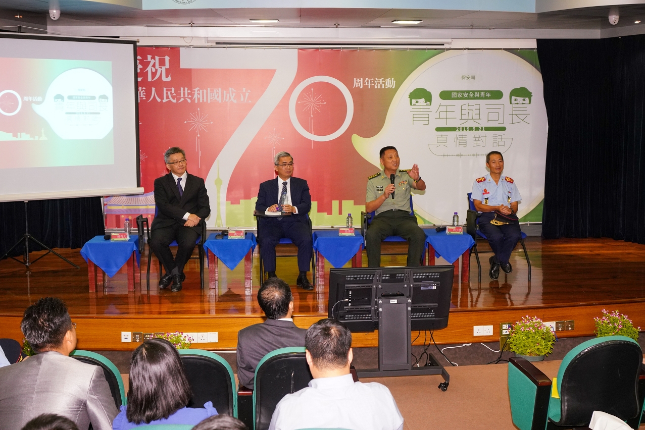 As forças e serviços da área para a segurança do Governo da RAEM co-realizaram na manhã  do dia 21 do mês corrente o evento “A área para a segurança comemora o 70.º aniversário da implementação da República Popular da China em diálogo sincero entre os jovens e o Secretário para a Segurança”. 170 jovens de diversas associações de Macau e os representantes das forças e serviços da área da segurança do Governo da RAEM celebraram em conjunto o 70.º aniversário da Nova China na Escola Superior das Forças de Segurança Pública de Macau. Na sessão de diálogo sincero com os jovens, o Secretário para a Segurança transmitiu-lhes a mensagem de respeito pelo Estado de direito, da boa situação de paz e tranquilidade que se usufrui em Macau e da importância de, conjuntamente com os diferentes sectores da sociedade, todos actuarem como guardiões da segurança geral do País e de Macau.