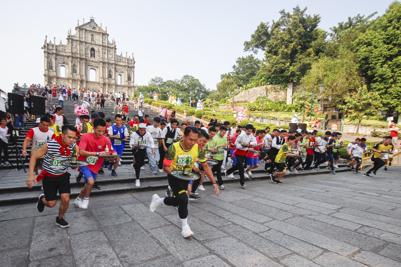 A tradicional Corrida de Bandejas decorreu à tarde, contando com perto de 180 participantes, em representação de 29 hotéis, restaurantes, entre outros estabelecimentos da cidade. Este ano, por ser assinalado o 20.º aniversário do estabelecimento da Região Administrativa Especial de Macau (RAEM), os participantes formaram fisicamente o número “20” para tirar uma fotografia de grupo nas Ruínas de S. Paulo antes da partida, adicionando o espírito festivo do aniversário ao evento. Na ocasião, houve também alguns participantes vestidos com trajes característicos relacionados com o tema do estabelecimento da RAEM. Os participantes segurando uma bandeja com uma garrafa de cerveja de Macau Beer, percorreram as ruas do Centro Histórico de Macau, partindo das Ruínas de S. Paulo, e seguindo em velocidade máxima transportando a garrafa de forma segura até à meta final no Largo do Senado. O percurso da empolgante corrida atraiu grande número de visitantes para tirar fotografias e dar força aos participantes, mostrando a atracção turística de Macau. Warren Obejas Cabada, do Sands Cotai Central, venceu a prova masculina da Corrida de Bandejas. A prova das senhoras foi ganha por Ye XiaoJing, do Future Bright Group. Os prémios para os melhores guarda-roupa foram para Ou Huanming, do Future Bright Group, e Choi Chi Wang, do Hotel Dragão Dourado.