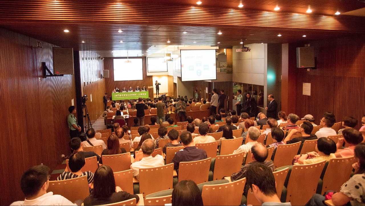 O Governo da Região Administrativa Especial de Macau (RAEM) realizou, no dia 17 de Outubro, das 20h00 às 21h30, no Auditório sito na cave do Edifício Administração Pública, a primeira sessão de consulta ao público sobre o Regime jurídico da renovação urbana de Macau, na qual participaram mais de 150 cidadãos, das quais 23 usaram da palavra. A sessão de consulta foi presidida pela Secretária para a Administração e Justiça, Chan Hoi Fan, e contou com a presença do Director da Direcção dos Serviços de Assuntos de Justiça, Liu Dexue, do chefe do Departamento de Planeamento Urbanístico da Direcção dos Serviços de Solos, Obras Públicas e Transportes, Mak Tat Io, do chefe do Departamento de Estudos do Instituto de Habitação, Iam Lei Leng, e da chefe do Departamento de Produção Legislativa, substituta, da Direcção dos Serviços de Assuntos de Justiça, Leong Weng In.
