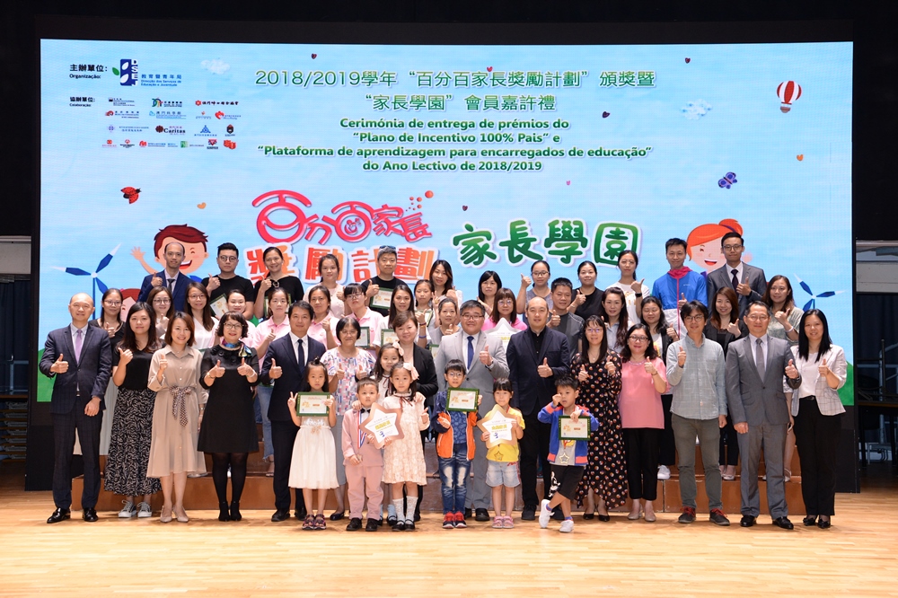 Para elogiar os encarregados de educação que participaram, no último ano, de forma entusiástica e positiva, nas actividades para a família e de educação parental, a DSEJ realizou a cerimónia de entrega de prémios do “Plano de Incentivo 100% Pais” e de louvores da “Plataforma de Aprendizagem para Encarregados de Educação” do ano lectivo de 2018/2019, bem como a cerimónia de lançamento do “Plano de Incentivo 100% Pais” do ano lectivo de 2019/2020, no dia 20 de Outubro, pelas 10h30, no auditório da Escola Luso-Chinesa Técnico-Profissional. As cerimónias contaram com a presença de vários convidados, nomeadamente, a Directora substituta da DSEJ, Leong Vai Kei, o Chefe do Departamento de Ensino, Kong Ngai, a Curadora do Museu das Comunicações da Direcção dos Serviços de Correios e Telecomunicações, Wong Kam Ian, e o chefe do Departamento de Exibições e de Educação do Centro de Ciência de Macau, Leong Si Chong, além de mais 60 representantes de instituições educativas e associações.