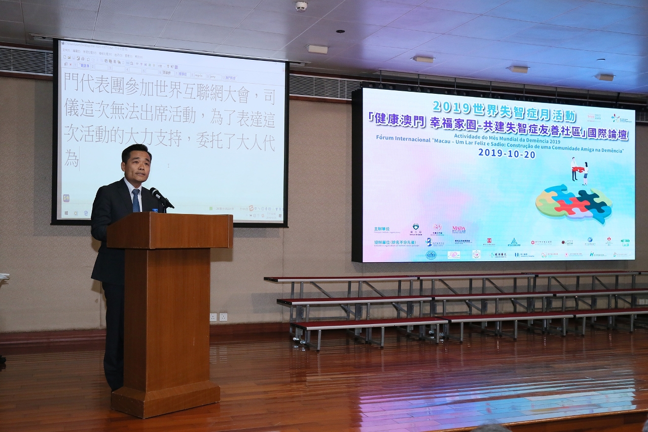 O assessor do Gabinete do Secretário para os Assuntos Sociais e Cultura, Dr. Lo Iek Long, substituiu o Secretário para os Assuntos Sociais e Cultura, Dr.º Alexis TAm , que apesar de ausente manifestou todo o apoio a esta actividade. No discurso Dr. Lo Iek Long salientou que a demência é uma doença crónica comum para idosos, já classificada pela OMS como assunto de saúde pública ao qual deve ser dado tratamento prioritário. Portanto, a fim de responder as oportunidades e os desafios causados pelo envelhecimento de população, o governo da RAEM lançou o “mecanismo de protecção ao idoso” e o “Plano Decenal de Acção dos Serviços de Apoio a Idosos 2016-2025”. A demência é considerada como um trabalho importante junto dos idosos, por isso, o governo criou o Centro de Avaliação e Tratamento da Demência, o Centro de Apoio à Demência e o Grupo de Trabalho de Demência, subordinado à Comissão de Prevenção e Controlo das Doenças Crónicas, através do efeito sinérgico pelos serviços multi-disciplinares, com a prestação de serviços one stop, daí o tempo de espera ter sido já reduzido, além de terem sido optimizados os procedimentos de forma a que os doentes com demência possam receber diagnósticos e tratamentos médicos apropriados.