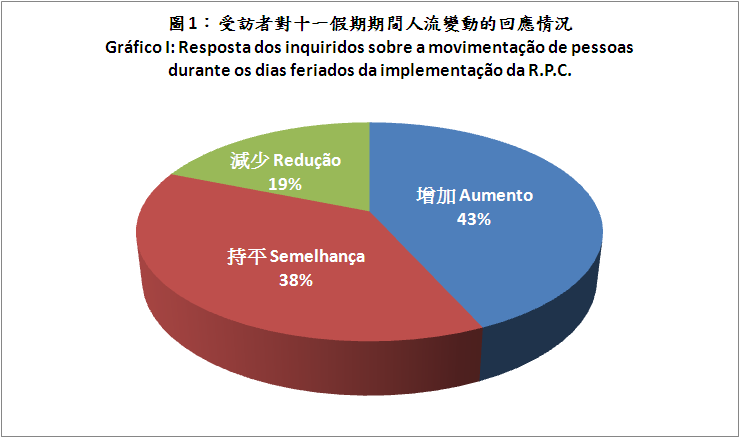 Durante o período compreendido entre dias 8 e 10 de Outubro, a Direcção dos Serviços de Economia (DSE) enviou pessoal a diferentes zonas da Península de Macau e das Ilhas para proceder ao inquérito de conjuntura aos estabelecimentos comerciais relativamente a este feriado, tendo sido inquiridos 1.564 comerciantes. Os locais envolvidos neste inquérito incluem Zona Norte, Avenida de Horta e Costa, Zona Central, Praia do Manduco, ZAPE, Taipa, e Resort Hotels and Shoppes na zona do Cotai, etc. Os resultados do inquérito revelaram que os dias feriados da implementação da R.P.C. tiveram uma função impulsionadora para o negócio dos sectores de restauração e comércio a retalho de Macau, registando-se, assim, aumentos na movimentação de pessoas e no volume de negócios face aos nos dias normais. Uma parte dos comerciantes inquiridos também afirmou que o seu volume de transacções teve um crescimento quando comparado com o período homólogo do ano passado. Ademais, verificou-se uma relação de proporcionalidade directa entre a movimentação de pessoas e o volume de negócios das lojas na maioria das zonas durante o referido feriado.