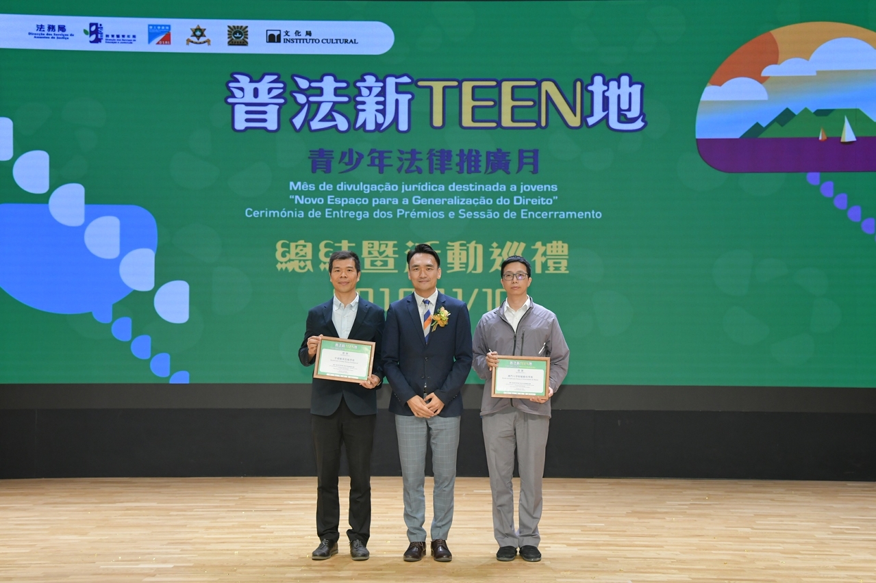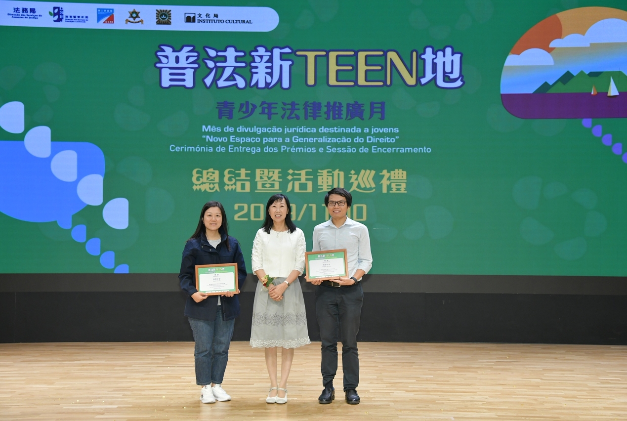 De modo a dar continuidade à promoção dos trabalhos de divulgação do direito e realizar o balanço dos resultados das actividades envolvidas, os serviços, acima mencionados, realizaram, no dia 10 de Novembro, no auditório da Escola Luso-Chinesa Técnico-Profissional, a sessão de conclusão e campanha sobre as actividades do mês da divulgação jurídica, destinada a jovens, no âmbito da actividade “Novo Espaço para a Generalização do Direito”, que contou com a presença dos seguintes convidados: subdirector da DSEJ, Kong Chi Meng, subdirectora da DSAJ, Leong Pou Ieng, vice-presidente do IC, Leong Wai Man, chefe do Departamento de Juventude da DSEJ, Cheong Man Fai, chefe substituto do Departamento de Emprego da DSAL, Cheong Kin Weng, chefe da Divisão de Educação Cívica do Instituto para os Assuntos Municipais, Lam Mei Sio, chefe da Divisão de Ligação entre Polícia e Comunidade e Relações Públicas da PJ, Cheang Pou Seong, chefe da Divisão de Serviços para Crianças e Jovens do Instituto de Acção Social, Lao Kit Im, chefe substituto da Divisão de Relações Públicas do Departamento de Operações do CPSP, Lei Tak Fai, chefe substituto da Divisão de Sensibilização, Divulgação e Relações Públicas do Corpo de Bombeiros, Lao Hou Wai, subcomissária dos Serviços de Polícia Unitários, Kam Chit Soi, vogais do Conselho de Educação para o Ensino Não Superior e do Conselho de Juventude e, ainda, representantes de escolas e instituições participantes.