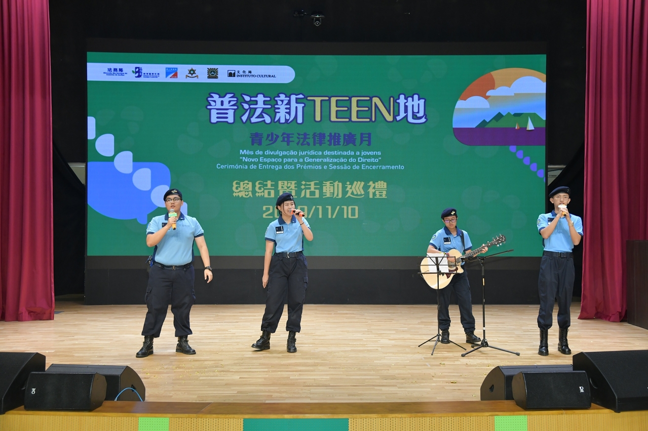 Na sessão de conclusão e campanha sobre as actividades, foram apresentados o conteúdo e os resultados das actividades, promovidas pelos vários serviços, que divulgaram conhecimentos jurídicos aos estudantes, jovens e residentes, com uma cobertura extensa. Para agradecer às escolas/instituições participantes o seu apoio, foram atribuídos 28 diplomas de agradecimento. No evento, alguns jovens partilharam os seus sentimentos decorrentes da participação nas actividades e manifestaram que as actividades do mês da divulgação foram ricas e diversificadas e que reforçaram o seu conhecimento e compreensão acerca das várias leis, tais como a “Constituição” e a “Lei Básica”, dos seus direitos e deveres e da importância do “conhecimento e cumprimento da lei”. Por ocasião do 70.º Aniversário da Implantação da República Popular da China e do 20.º Aniversário do Retorno de Macau à Pátria, foram realizadas, no local do evento, sessões interactivas e espectáculos, preparados pelos co-organizadores, que incluíram um jogo interactivo sobre informações jurídicas com os jovens presentes realizado sob a orientação de membros da “força motriz para a divulgação jurídica”, os membros do projecto “Guia juvenil para combater o crime” trouxeram um espectáculo de dança de leão, a exibição de eloquência “Hino Nacional e Eu”, proferida pela vencedora do 2.º lugar Xie Maggie no Concurso de Discursos intitulado “Eu, a Constituição e a Lei Básica”, bem como o canto da música “Nunca Desistir” pelos membros do Grupo Juvenil da CPSP, com o intuito de divulgar informações para uma escola harmoniosa, tendo o evento do dia terminado numa atmosfera animada.