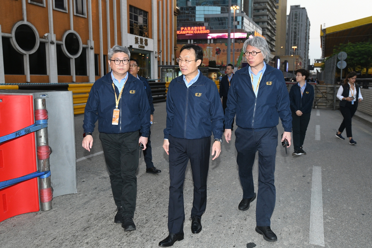 O secretário Alexis Tam, o presidente do Instituto do Desporto e coordenador da COGPM, Pun Weng Kun, e os representantes da FIA procederam à inspecção do Circuito da Guia e cumprimentaram os trabalhadores. Durante a inspecção, o secretário fez questão em inteirar-se sobre as medidas de segurança e outros assuntos relacionados com a pista.