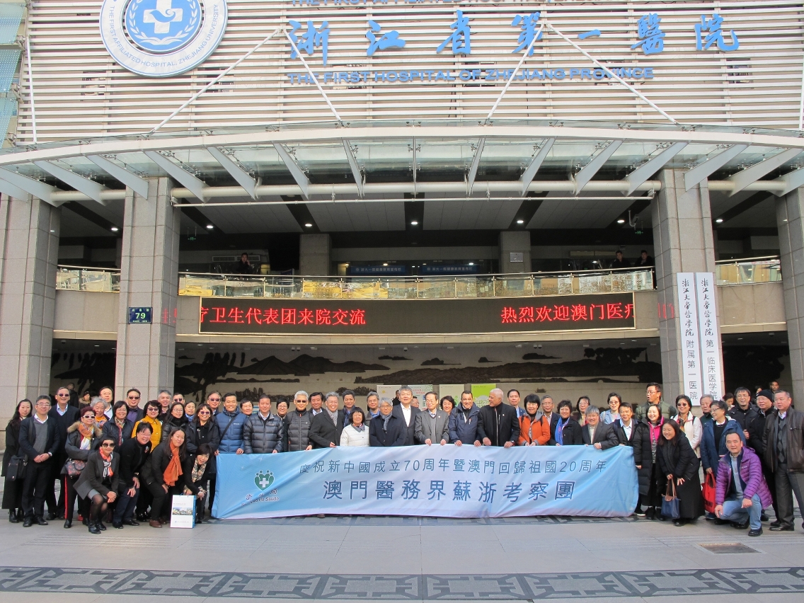 Na manhã do dia 28 de Novembro, a delegação de Macau visitou o Primeiro Hospital Afiliado da Faculdade de Medicina da Universidade de Zhejiang. As instalações são compostas por um Edifício Inteligente de Consulta Externa de primeira classe, um Edifício Complexo de Tecnologia Médica e um Edifício Complexo da Enfermaria. Neste local também foi criado o primeiro Centro de Medicina Translacional na Província de Zhejiang e também do Interior da China. O Acordo de cooperação assinado pelo Grupo Alibaba prevê tornar este tipo de Hospital como uma unidade modelo de medicina inteligente. O Hospital possui os vários laboratórios nacionais importantes, designadamente, o Laboratório Chave Estatal de Diagnóstico e Tratamento de Doenças Infecciosas, o Laboratório Chave de Pesquisa em Transplantes de Vários Órgãos do Ministério da Saúde. Foram já efectuados neste hospital casos bem-sucedidos de transplante de fígado e vesícula biliar, sendo este o terceiro caso com sucesso no país e, também foi neste hospital que foi realizado o primeiro caso mundial com sucesso de transplante de intestino delgado entre doadores vivos. Sob a recepção da Dr.a Zheng Min, sub-Directora do hospital, foi realizado um intercâmbio profundo entre o hospital em Zhejiang e a delegação de Macau. O sub-Director na área dos assuntos gerais desse hospital, Dr. Qiu Yunqing, apresentou o desenvolvimento do hospital, por sua vez, o Chefe do Gabinete de Estudos e Planeamento dos Serviços de Saúde da RAEM, Dr. Wong Cheng Po, apresentou a situação geral de assistência médica e saúde em Macau, respectivamente.