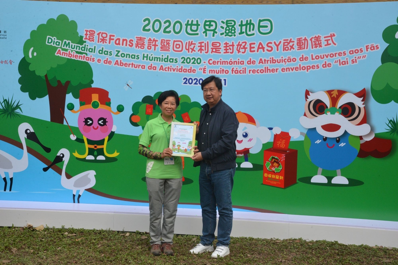 Para comemorar o Dia Mundial das Zonas Húmidas, assinalado no dia 2 de Fevereiro, a DSPA organiza no dia 11 de Janeiro de 2020 o referido evento nas Zonas Ecológicas do Cotai, onde o Director da DSPA, Eng. Tai Vai Man e o Fong Ka Fai, vice-presidente da Federação das Associações dos Operários de Macau (FAOM), quer a entidade coorganizadora do Programa de Pontos “Verdes” – O comportamento ambientalmente correcto pode ser divertido, entregam louvores aos Fãs Ambientais que desempenharam guias excelentes nas vistas às Zonas Ecológicas do Cotai.