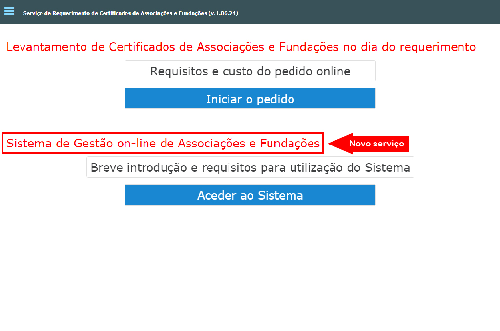 As pessoas que reúnam os requisitos para acederem ao sistema poderão utilizá-lo fazendo log in a partir do website da DSI (www.dsi.gov.mo/ “serviços on-line”/ “requerimento do certificado de associação e fundação”/ “sistema de gestão on-line de associações e fundações”). Após a confirmação, pela DSI, da lista registada dos titulares dos órgãos sociais, o Certificado de composição dos corpos gerentes requerido on-line poderá ser levantado, decorridos três dias úteis, na DSI, ou noutros locais de atendimento indicados para o efeito, mediante a exibição do talão emitido e efectuado o pagamento das taxas.
