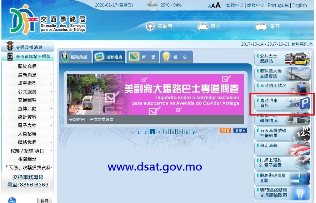 Para mais informações consulte as informações de estacionamento na página electrónica da DSAT em www.dsat.gov.mo, clicando na coluna – Informação em tempo real de estacionamento. Este método permite facilitar a procura de estacionamento, aumentando, ao mesmo tempo, a rotatividade dos lugares disponíveis. As informações estarão também disponíveis na aplicação móvel “Posto de Informação de Tráfego”.