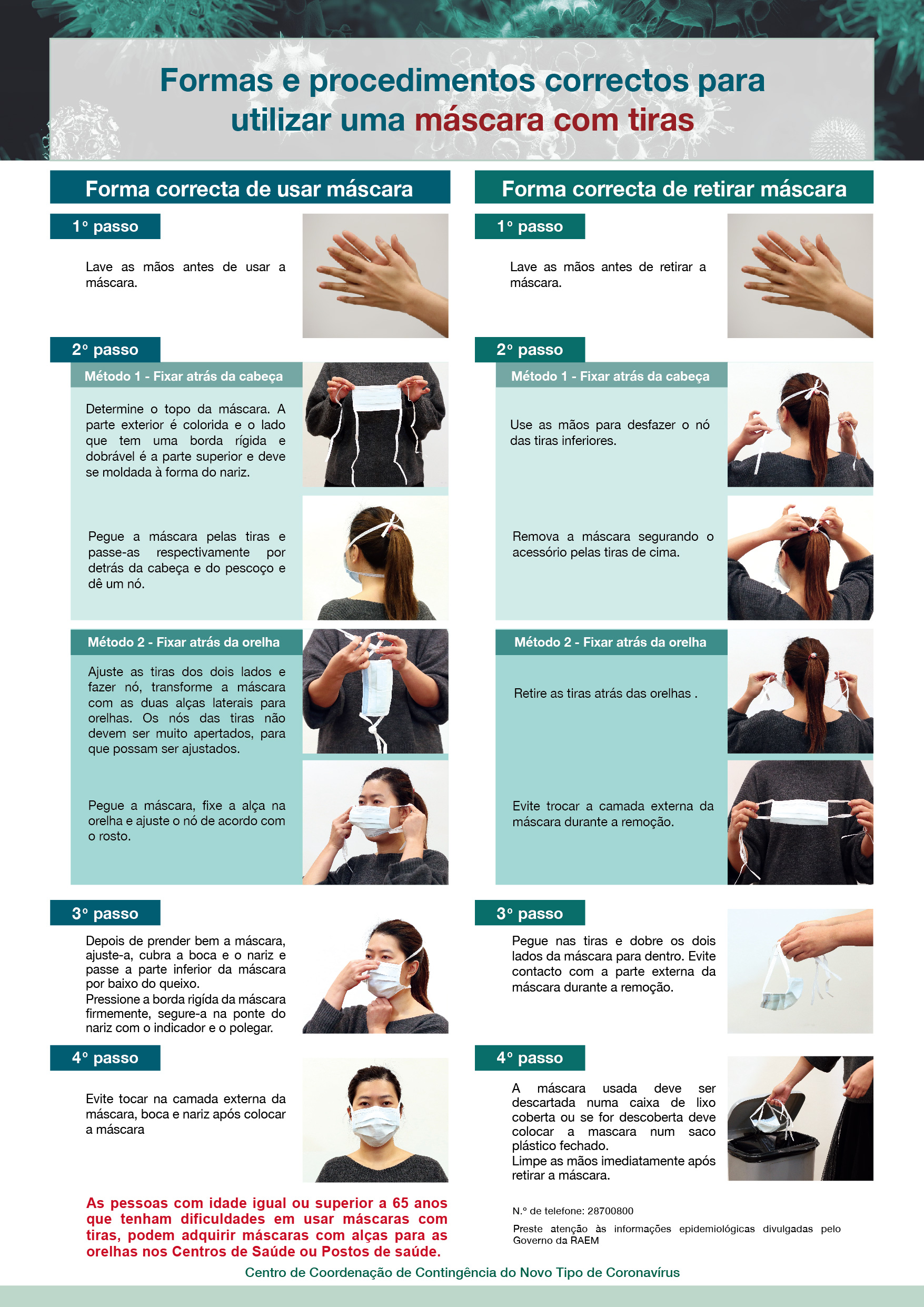 As pessoas com idade igual ou superior a 65 anos que tenham dificuldades em usar máscaras com tiras, podem adquirir mascaras com elásticos nos Centros de Saúde ou Postos de Saúde.