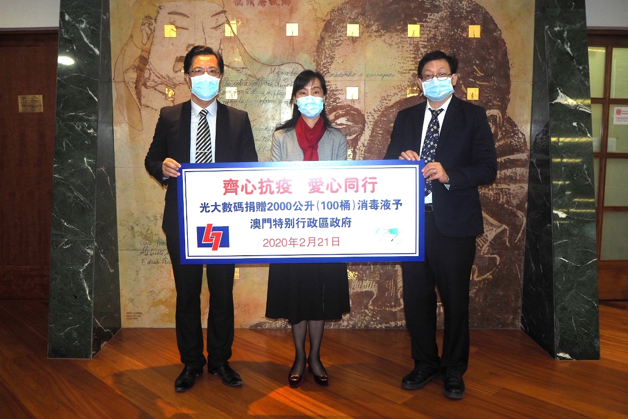 O Governo da RAEM recebeu, hoje (dia 21), 2 mil litros de desinfectantes oferecidos pela Companhia de Tecnologia Digital Kuong Tai, Limitada, e mais 50 mil máscaras doadas pela Agência Comercial Seng Kuong da Vittório Limitada.