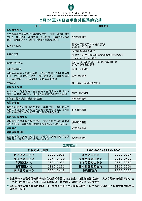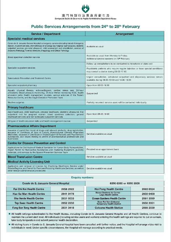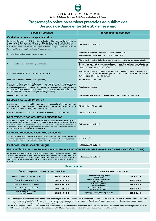 Para garantir a segurança dos residentes e reduzir o fluxo de pessoas nas áreas clínicas, os Serviços de Saúde anunciam a seguinte programação sobre a prestação de cuidados de saúde entre 24 e 28 de Fevereiro: