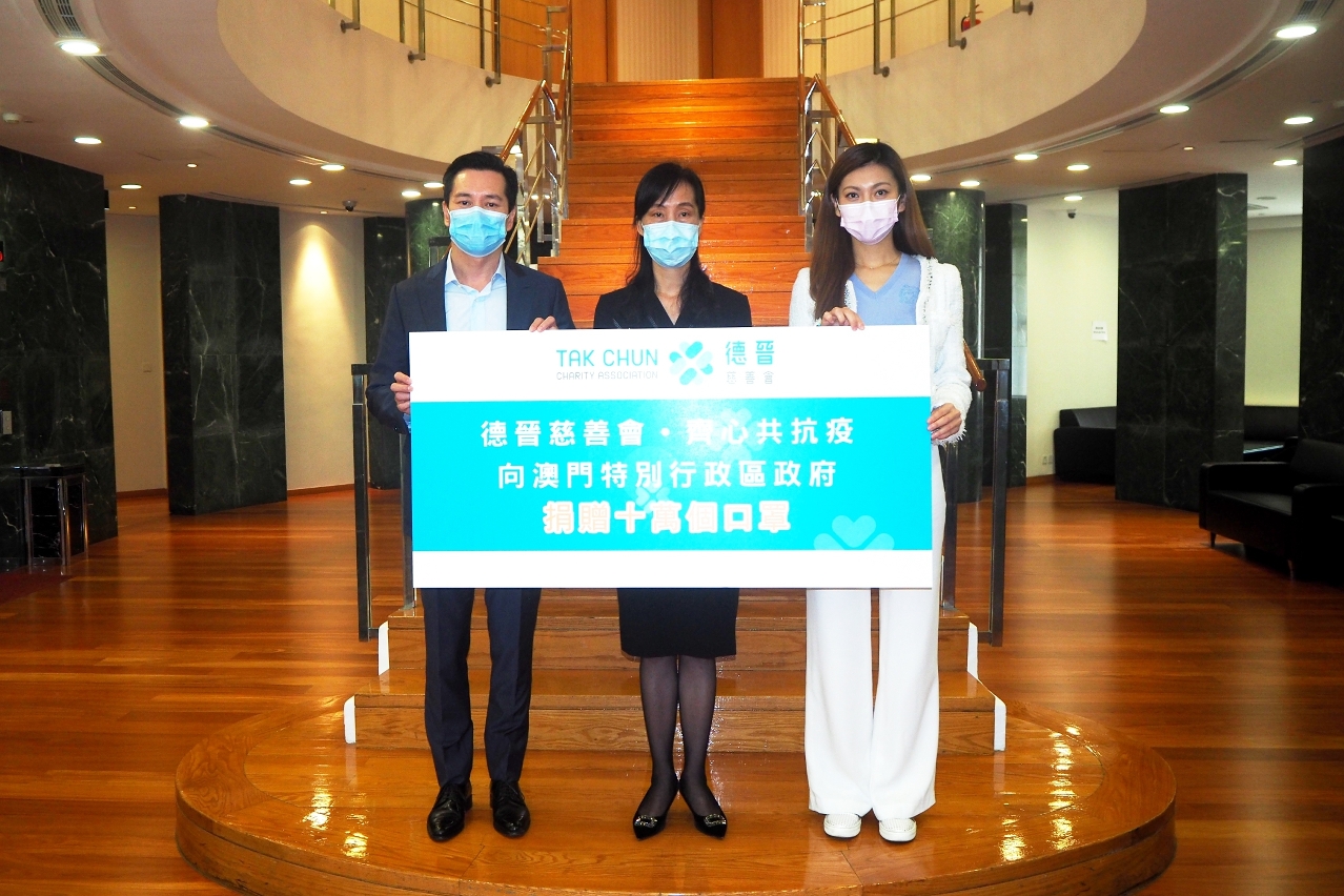 A Secretária para os Assuntos Sociais e Cultura, Ao Ieong U, recebeu hoje (dia 28), em representação do Governo da RAEM, 100 mil máscaras, 50 mil máscaras e 1 mil desinfectantes com álcool, oferecidos, respectivamente, pelas Associação de Beneficência Tak Chun, empresa Aristocrat (Macau) Pty Ltd e Atlantis Fábrica de Produtos Farmacêuticos.