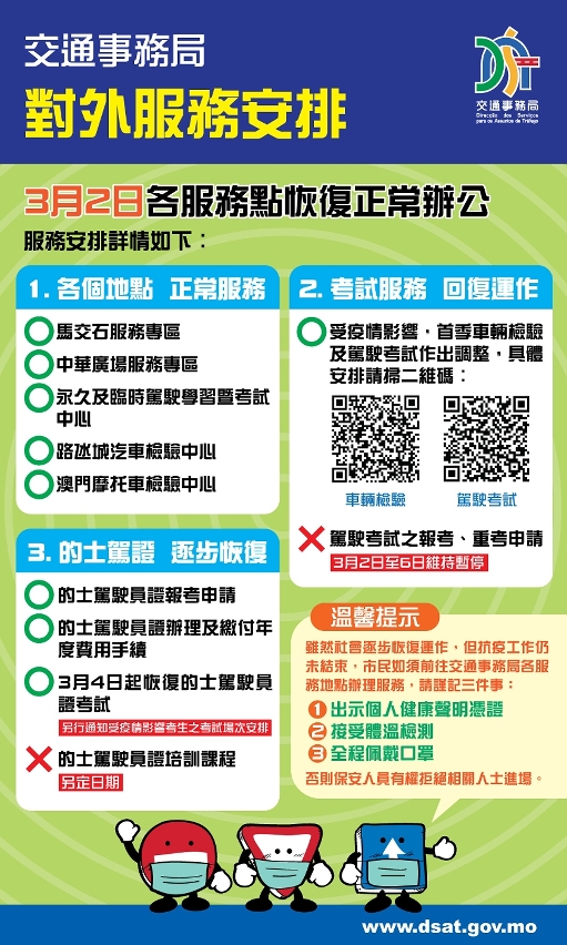 Tendo em conta a evolução epidémica do novo tipo de coronavírus, todos os serviços da Direcção dos Serviços para os Assuntos de Tráfego (DSAT) retomam o seu funcionamento normal a partir de 2 de Março (segunda-feira), para a prestação de serviços externos, tais como inspecção de veículos, exame de condução, candidatura de exame para obtenção do cartão de identificação de condutor de táxis, procedimento de pagamento de taxa anual, entre outros. A fim de tratar da melhor forma os respectivos trabalhos, o procedimento de candidatura de exame de condução e pedido de repetição de exame fica suspenso entre 2 (segunda-feira) e 6 (sexta-feira) de Março.