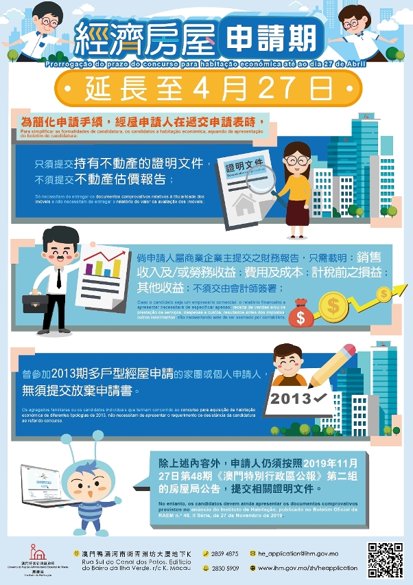 De acordo com o anúncio do Instituto de Habitação (IH), publicado no Boletim Oficial da RAEM n.º 10, II Série, de 4 de Março de 2020, para simplificar as formalidades de candidatura, os candidatos, aquando de apresentação do boletim de candidatura, não necessitam de anexar o relatório do valor da avaliação dos imóveis e o requerimento de desistência de anterior concurso, bem como o relatório financeiro a anexar, não necessita de ser assinado por contabilista. No entanto, os candidatos devem ainda apresentar os documentos comprovativos previstos no anúncio do IH, publicado no Boletim Oficial da RAEM n.º 48, II Série, de 27 de Novembro de 2019.