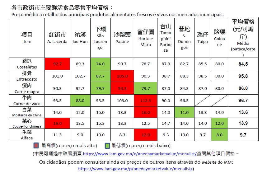 (Os cidadãos podem consultar ainda os preços de outros itens através do website do IAM: https://www.iam.gov.mo/p/onedaymarketvalue/menulist/)