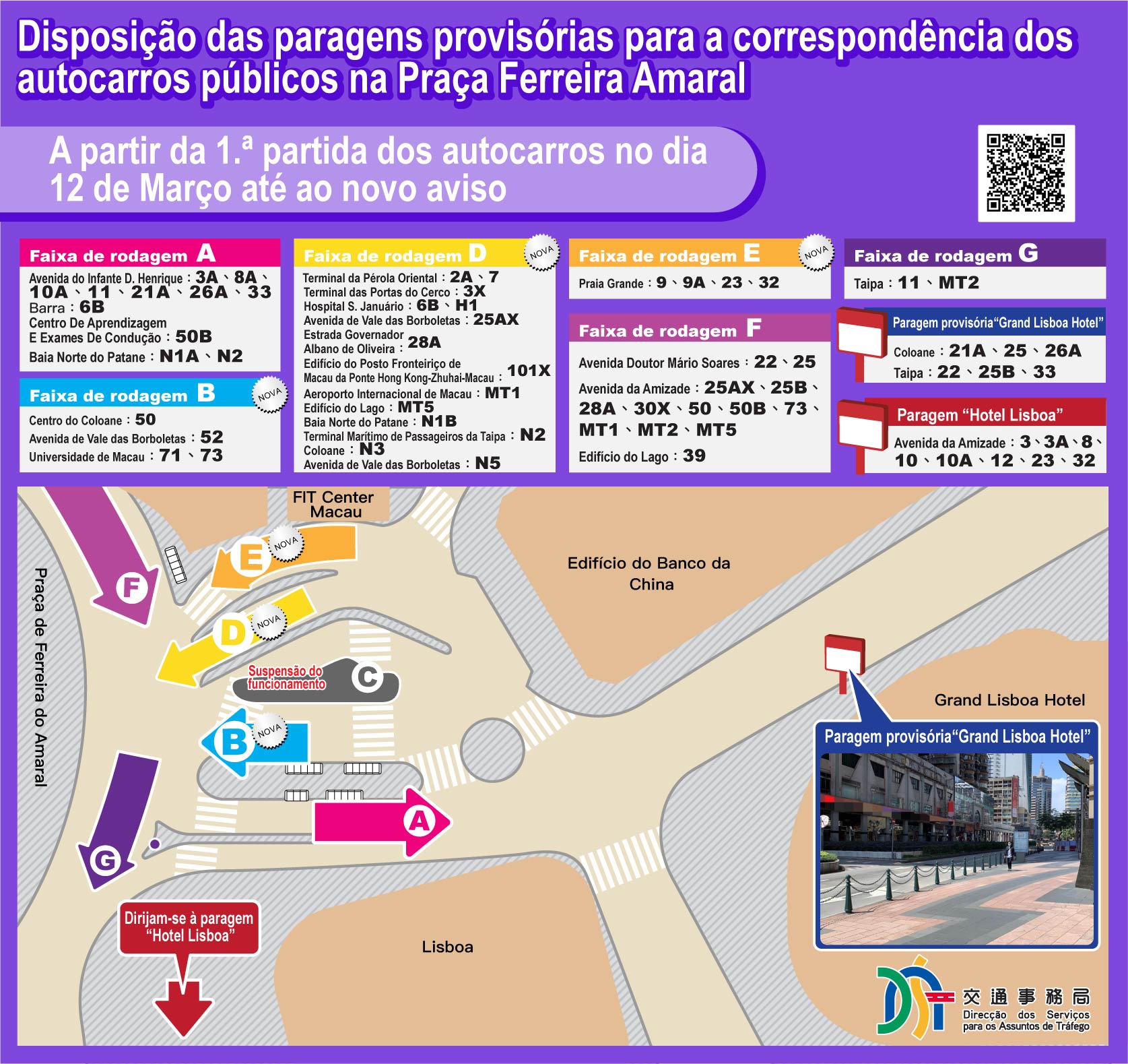 A 1.a etapa da fase I das obras de construção civil de reordenamento da Praça de Ferreira do Amaral vai terminar em breve e a 2.a etapa das obras começa em 12 de Março (5.a-feira). No mesmo dia, será fechada, com a primeira partida de autocarro, a faixa de rodagem C da Praça de Ferreira do Amaral e as paragens das faixas de rodagem B e C irão sofrer provisoriamente alteração de localização, consoante o mapa em anexo. Em simultâneo, as carreiras n.os 50, 50B, 52 e 71 passam definitivamente a ser carreiras de percurso circular, deixando de utilizar a Praça de Ferreira do Amaral como terminal. A Direcção dos Serviços para os Assuntos de Tráfego apela a que os passageiros prestem atenção a isto.