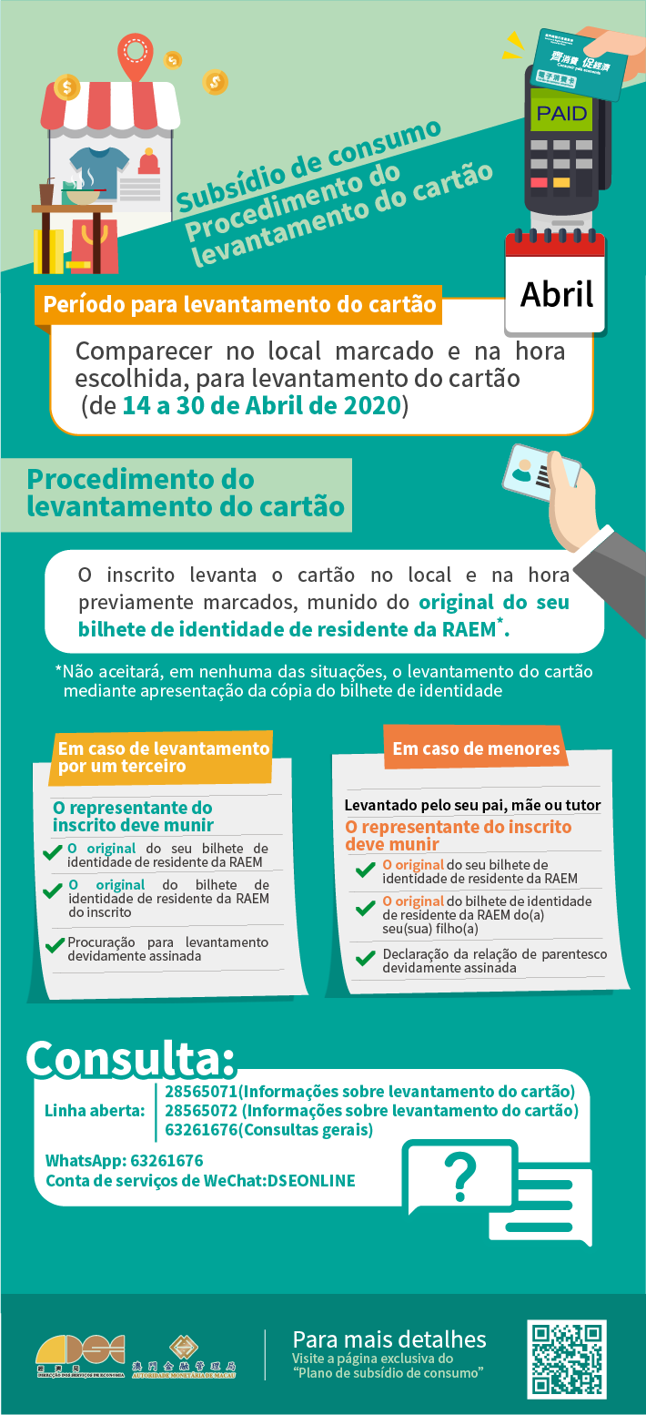 Encontram-se disponíveis, na página exclusiva sobre “Plano de subsídio de consumo” (https://www.economia.gov.mo/consumo/), os detalhes do Plano como locais de levantamento do cartão e horário de expediente dos mesmos;