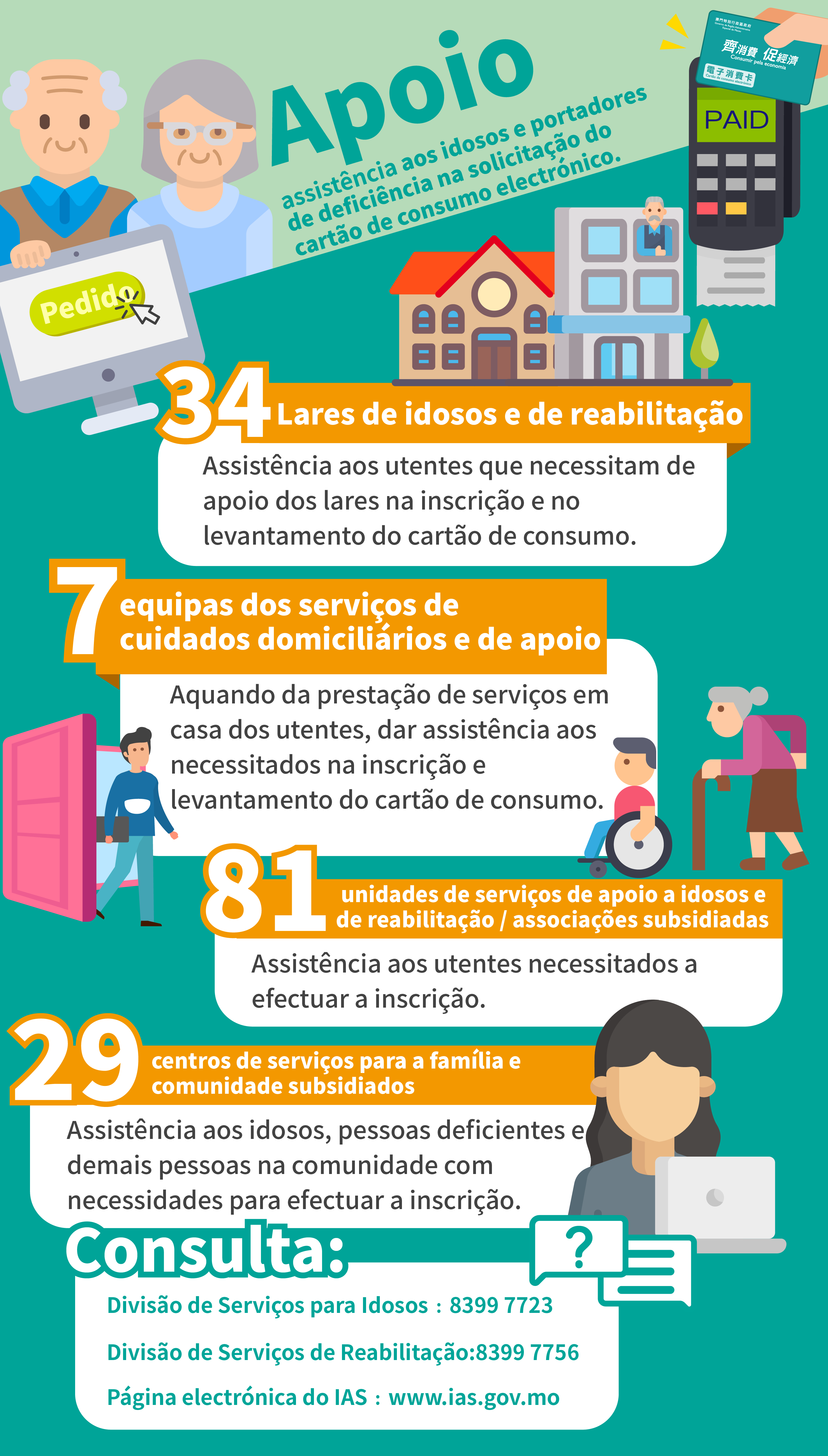 O IAS coordenou com 34 lares de idosos e de reabilitação para prestar auxílio a idosos e pessoas deficientes alojados em lares para efectuar a inscrição e demais formalidades necessárias à inscrição e levantamento do cartão em causa. Simultaneamente, o IAS também coordenou com sete equipas dos serviços de cuidados domiciliários e de apoio e 81 centros diurnos de idosos e de reabilitação subsidiados/associações no sentido de prestar ajuda aos utentes necessitados no tratamento das formalidades necessárias à inscrição;