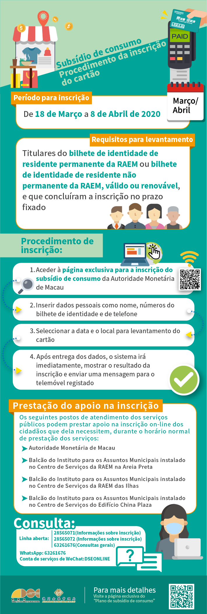Os residentes também podem consultar as informações sobre o Plano através do Whatsapp (63261676), da conta de serviços de Wechat (DSEONLINE) ou do e-mail (consumo@economia.gov.mo).