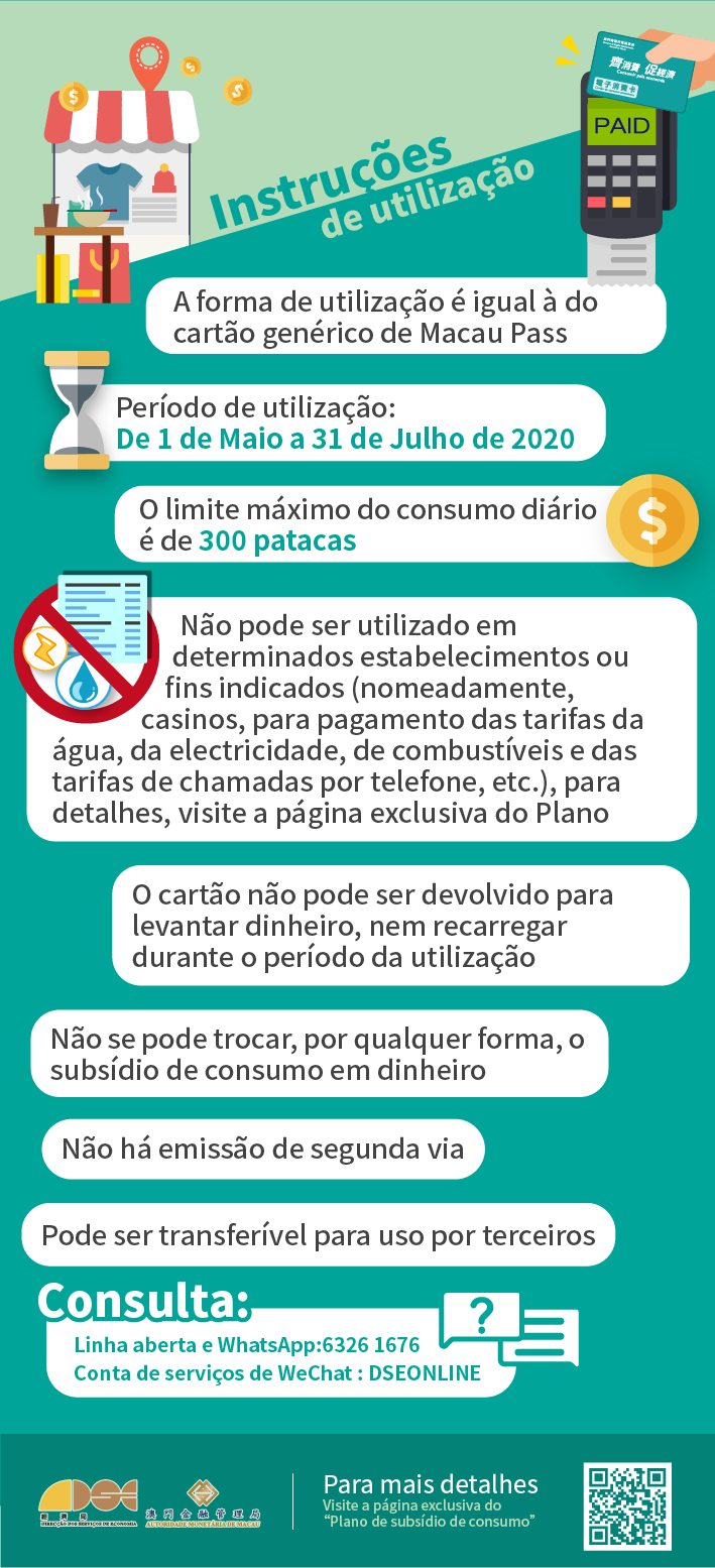 O prazo de utilização do subsídio de consumo é de 1 de Maio até 31 de Julho e a sua utilização tem um limite máximo diário de 300 patacas. O subsídio de consumo apenas pode ser utilizado para aquisição de produtos ou serviços, não podendo ser trocado em dinheiro nem utilizado nos estabelecimentos ou fins específicos previstos pelo respectivo diploma legal, tais como casinos, serviços turísticos no exterior e serviços médicos;