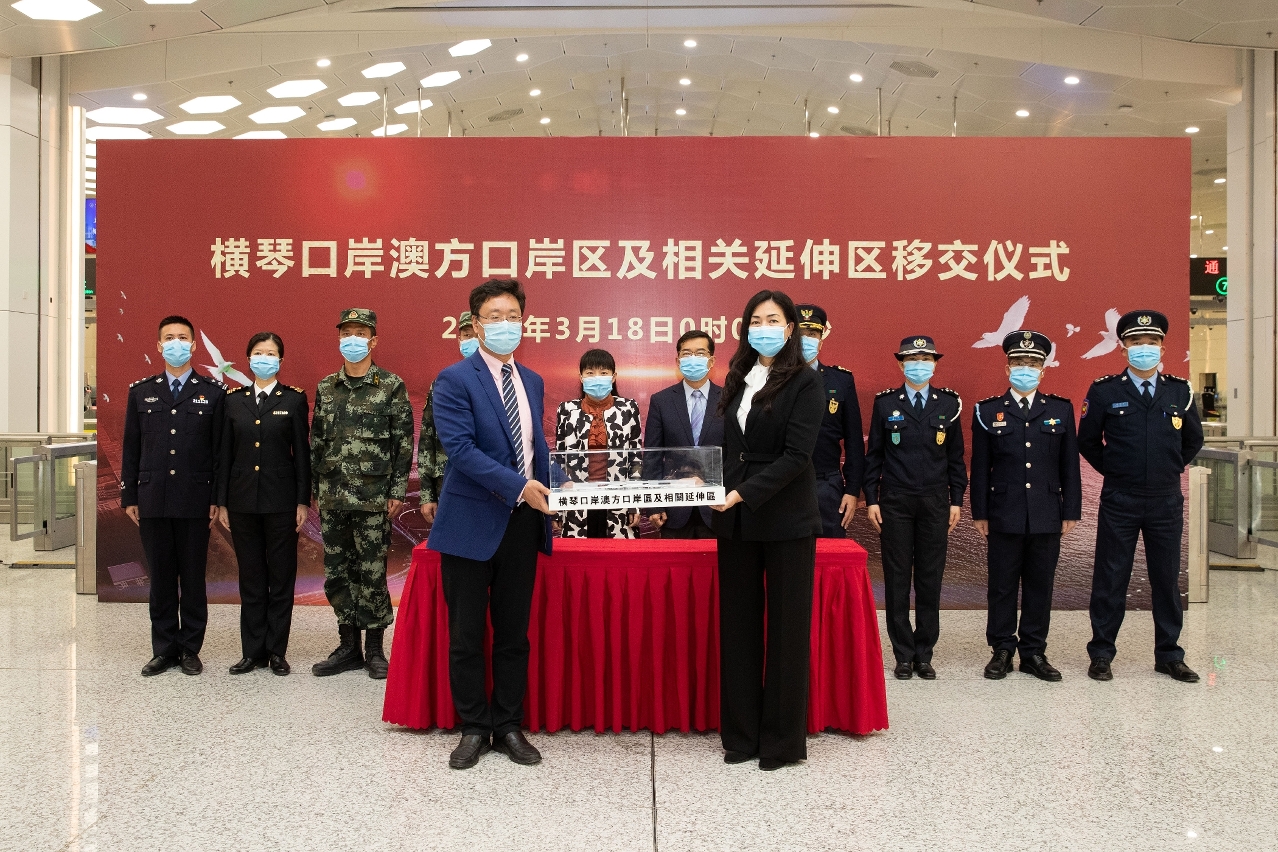 Assim, os governos de Macau e de Zhuhai realizaram a cerimónia de entrega do posto de Macau na área fronteiriça de Hengqin, na zona de inspecção de passageiros, pelas 00h00 horas do dia 18 de Março. Na ocasião, o director do Gabinete dos Assuntos de Taiwan, Hong Kong e Macau do Município Zhuhai, Zou Hua, leu a resposta do Conselho de Estado e, de seguida, o vice-presidente do Conselho de Gestão da Nova Zona de Hengqin, Wu Chuangwei, entregou um símbolo da Zona do Posto Fronteiriço da Parte de Macau do Posto Fronteiriço Hengqin (uma miniatura figurativa desta zona fronteiriça) à Directora dos Serviços das Forças de Segurança de Macau, Kok Fong Mei.