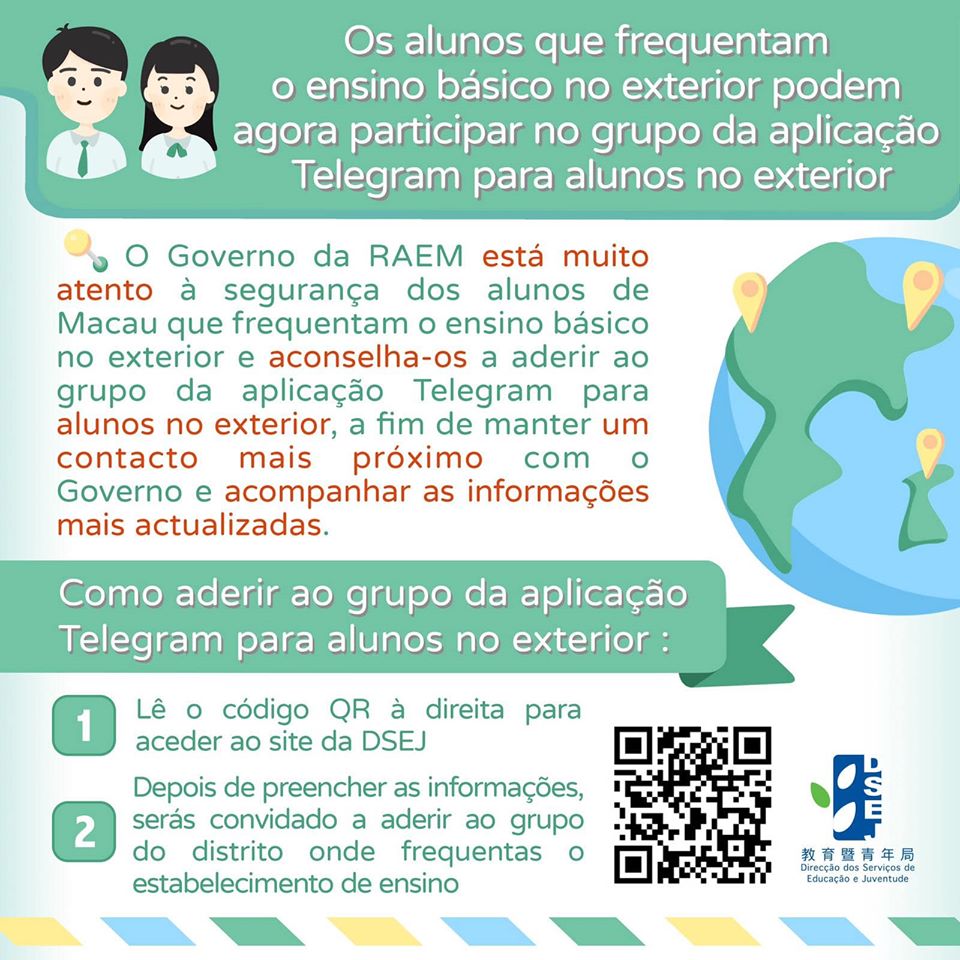 Em virtude da actual situação global da pneumonia provocada pelo novo tipo de coronavírus, o Governo da RAEM mantém-se muito atento à segurança dos alunos de Macau que frequentam o ensino básico no exterior. Neste sentido, a Direcção dos Serviços de Educação e Juventude (DSEJ) cooperou com a Direcção dos Serviços do Ensino Superior (DSES) para expandir o actual grupo da aplicação Telegram da DSES, dedicado a alunos do ensino superior a estudar no exterior, para incluir alunos do ensino básico a estudar também no exterior. O Governo da RAEM tenciona, desta forma, manter uma comunicação e contacto próximos com os alunos de Macau a frequentar o ensino básico em diferentes países e anunciar, de modo oportuno, medidas de assistência e informações actualizadas sobre a prevenção de epidemias; tanto estes alunos como os seus pais são convidados a aderir ao grupo. Desta forma, a DSEJ criou um site especial (https://s.dsej.gov.mo/qa/Q0000109/), através do qual os interessados devem preencher as respectivas informações pessoais e escolares para aderirem ao grupo da zona onde frequentam o estabelecimento escolar.