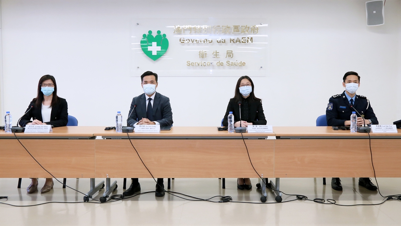 O Centro de Coordenação de Contingência do Novo Tipo de Coronavírus organizou esta sábado (4 de Abril) a conferência de imprensa, onde estiverem presentes o Médico-Adjunto da Direcção do CHCSJ, Dr. Lo Iek Long, a Chefe do Departamento de Licenciamento e Inspecção da Direcção dos Serviços de Turismo, Dr.ª Inês Chan, o Chefe da Divisão de Ligação entre Polícia e Comunidade e Relações Públicas, Dr. Lei Tak Fai, a Coordenadora do Núcleo de Prevenção e Doenças Infecciosas e Vigilância da Doença do Centro de Prevenção e Controlo da Doença, Dr.ª Leong Iek Hou.
