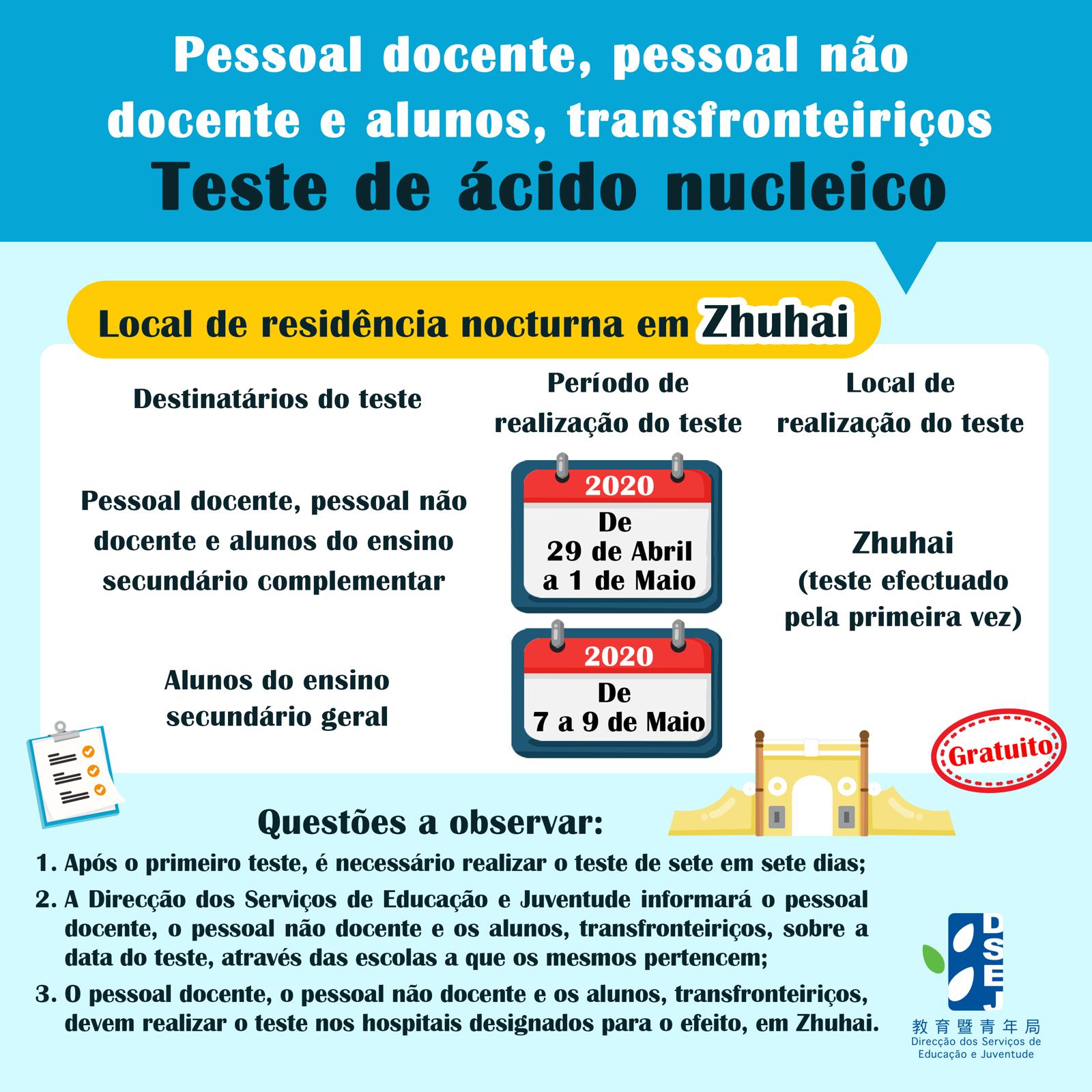 O pessoal docente e não docente transfronteiriço, bem como os alunos que não residem em Macau, devem realizar o teste de sete em sete dias, a fim de poderem deslocar-se, livremente, entre Zhuhai e Macau. Em relação a esta matéria, a DSEJ e os Serviços de Saúde cooperaram, de perto, com os serviços concernentes do Interior da China, para que os testes fossem realizados em hospitais de Zhuhai, especialmente designados para esse efeito. O pessoal docente, o pessoal não docente e os alunos, transfronteiriços, serão informados, através das suas escolas, dos detalhes e disposições dos testes, nomeadamente, data, hora e local, entre outros.