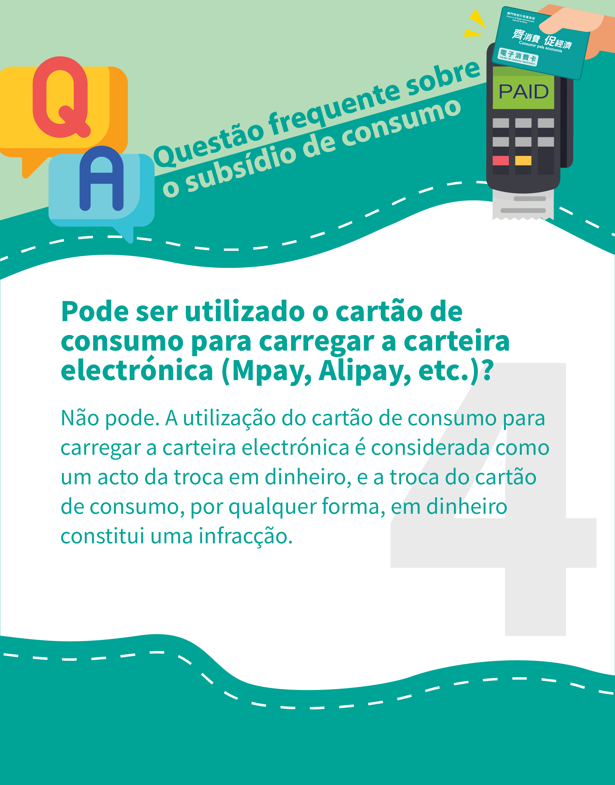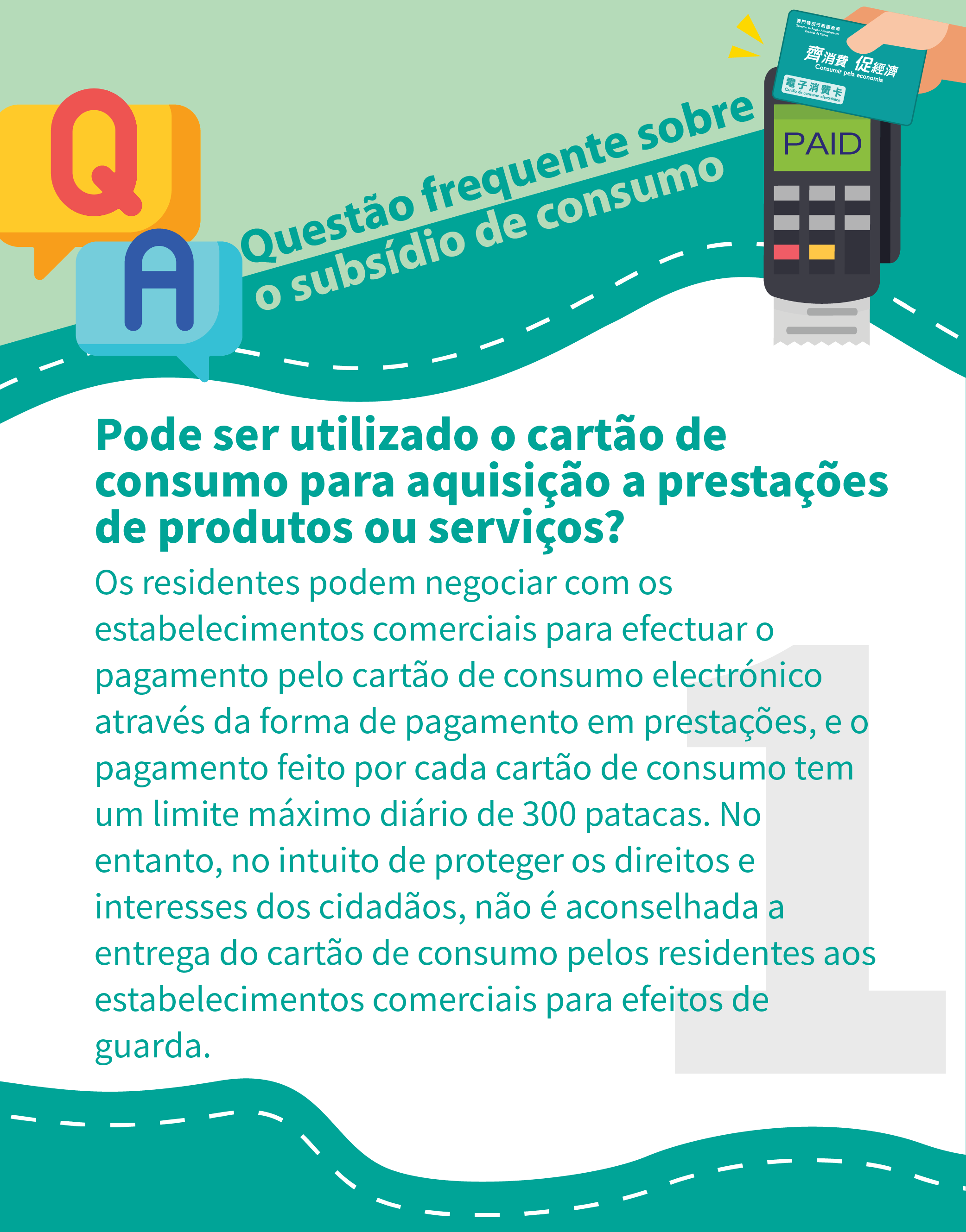 Os residentes podem negociar com os estabelecimentos comerciais para efectuar o pagamento pelo cartão de consumo electrónico através da forma de pagamento em prestações, e o pagamento feito por cada cartão de consumo tem um limite máximo diário de 300 patacas. No entanto, no intuito de proteger os direitos e interesses dos cidadãos, não é aconselhada a entrega do cartão de consumo pelos residentes aos estabelecimentos comerciais para efeitos de guarda.