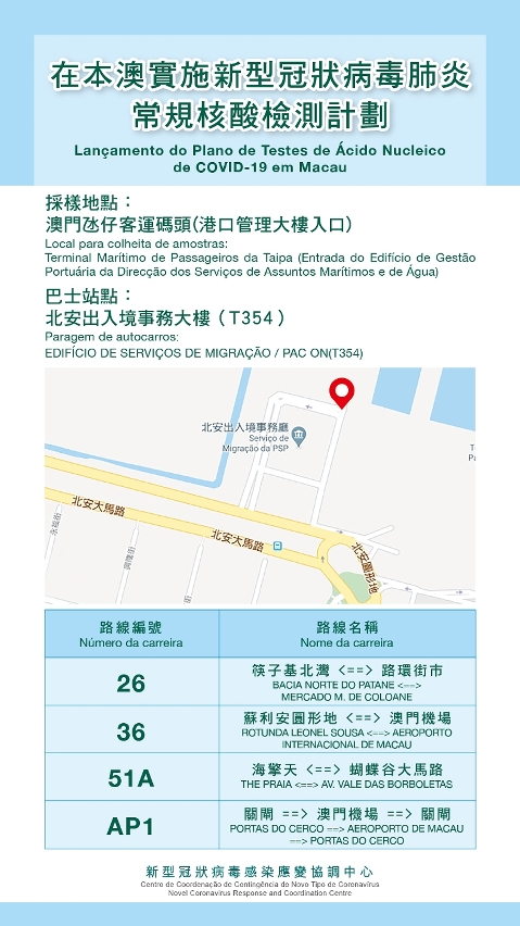 O “Plano de Teste Regular de Ácido Nucleico de COVID-19” destinado aos residentes de Macau teve início às 09h00 do dia 7 de Maio. Em resposta às referidas perguntas, o Médico-Adjunto Dr. Lo Iek Long manifestou que, a prestação de serviço de exames é feita através da cooperação entre os Serviços de Saúde e a “Companhia de Higiene Exame Kuok Kim (Macau) Limitada”. Ao nível dos Serviços de Saúde, até às 12h00 de hoje (nas últimas 24 horas), foram realizados 1.334 testes de de ácido nucleico. Com o intuito de facilitar a deslocação dos cidadãos ao local de amostragem para a prestação de testes de ácido nucleico, situado no Terminal Marítimo de Passageiros da Taipa (Entrada do Edifício de Gestão Portuária da Direcção dos Serviços de Assuntos Marítimos e de Água), foram disponibilizadas as informações relativas aos itinerários dos autocarros (Cfr. foto anexada) no Sistema da Reserva Online. Além disso, também irão ser colocadas as placas indicativas in loco, de forma a que os cidadãos possam facilmente identificar a entrada.