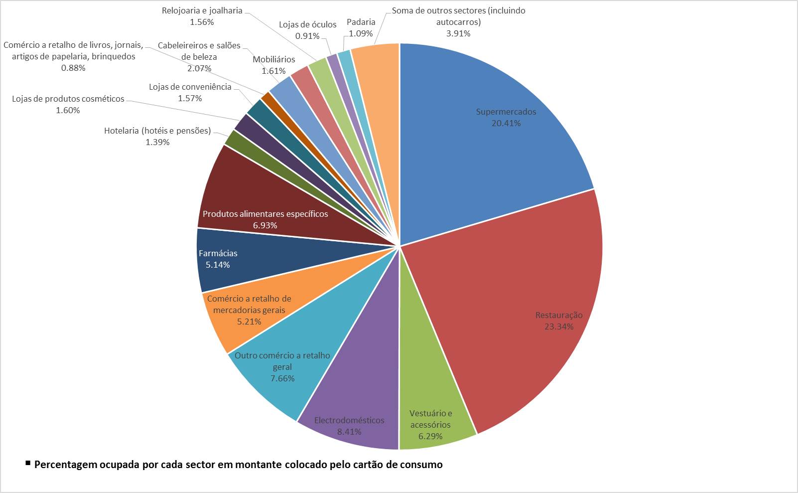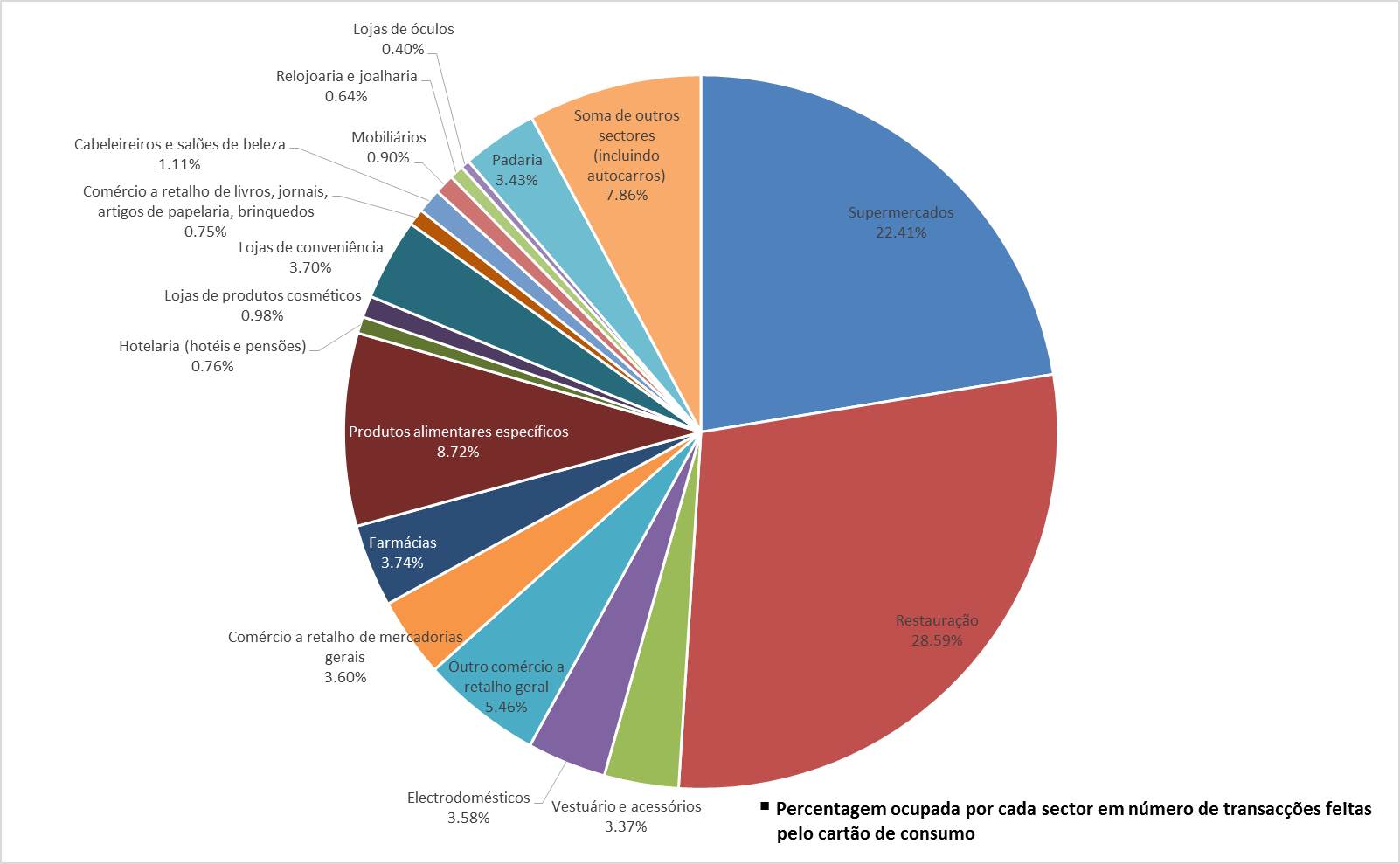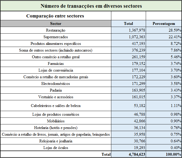 Ordenados conforme o número das transacções, no período entre os dias 1 e 10 de Maio, os primeiros cinco sectores são restauração, supermercados, produtos alimentares específicos, soma de outros sectores (incluindo autocarros) e outro comércio a retalho geral, representando, respectivamente, 28,59%, 22,41%, 8,72%, 7,86% e 5,46%.
