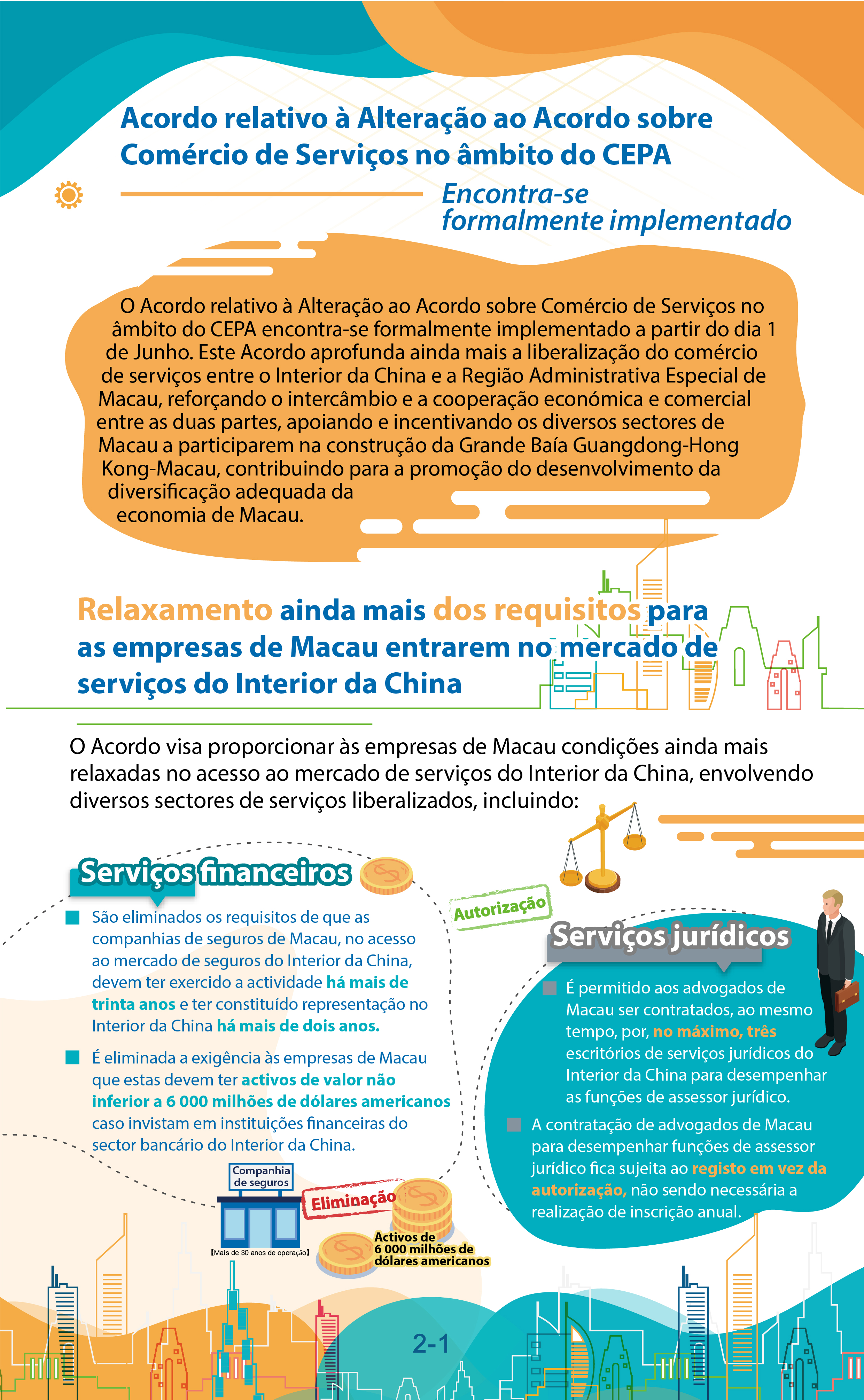 O Acordo visa proporcionar às empresas de Macau condições ainda mais relaxadas no acesso ao mercado de serviços do Interior da China e os sectores de serviços envolvidos incluem serviços financeiros, jurídicos, de contabilidade, de construção e engenharia, de cultura, de turismo, de distribuição e de educação, para os quais são acrescentadas medidas de liberalização com base nas medidas já existentes, com vista a proporcionar condições mais favoráveis para o desenvolvimento das empresas e profissionais de Macau no Interior da China.