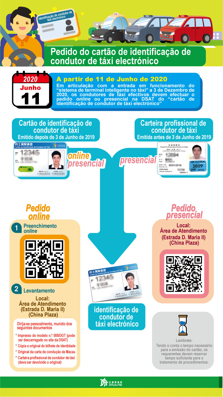 Em articulação com a entrada em funcionamento do “sistema de terminal inteligente no táxi” a 3 de Dezembro de 2020, os condutores de táxi efectivos devem efectuar o pedido do “cartão de identificação de condutor de táxi electrónico”. A Direcção dos Serviços para os Assuntos de Tráfego (DSAT) começa o tratamento do pedido a partir de 11 de Junho (quinta-feira).